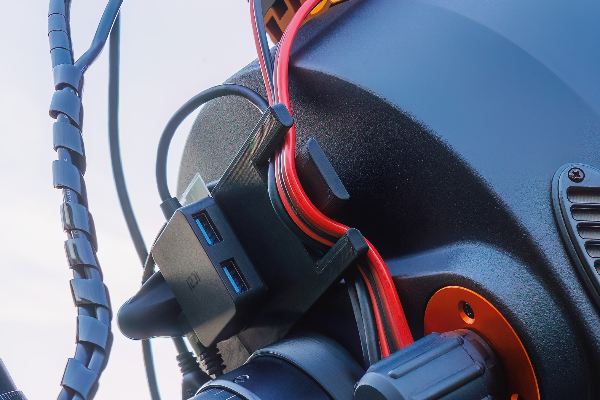 Zusätzlich vereinfacht diese Bündelung die Handhabung deutlich, insbesondere beim Auf- und Abbau des Equipments. Statt mehrere einzelne Kabel führen zu müssen, handhabt man nur noch einen klar definierten Strang. In meinem Fall habe ich beispielsweise das USB-Kabel und die Stromversorgung für die Kameras zu einem gemeinsamen Strang zusammengefasst. Solche Kabelstränge habe ich bei mir mehrfach im Einsatz, da sie immer gleich aufgebaut sind und sich dadurch schnell, reproduzierbar und fehlerarm verwenden lassen. Trotz dieser Vorteile sollte man sich jedoch bewusst sein, dass das Bündeln mehrerer Leitungen zwangsläufig zu einem dickeren und steiferen Kabelstrang führt, was je nach Einbausituation auch zum Nachteil werden kann und bei bewegten Bereichen sorgfältig abgewogen werden sollte.
