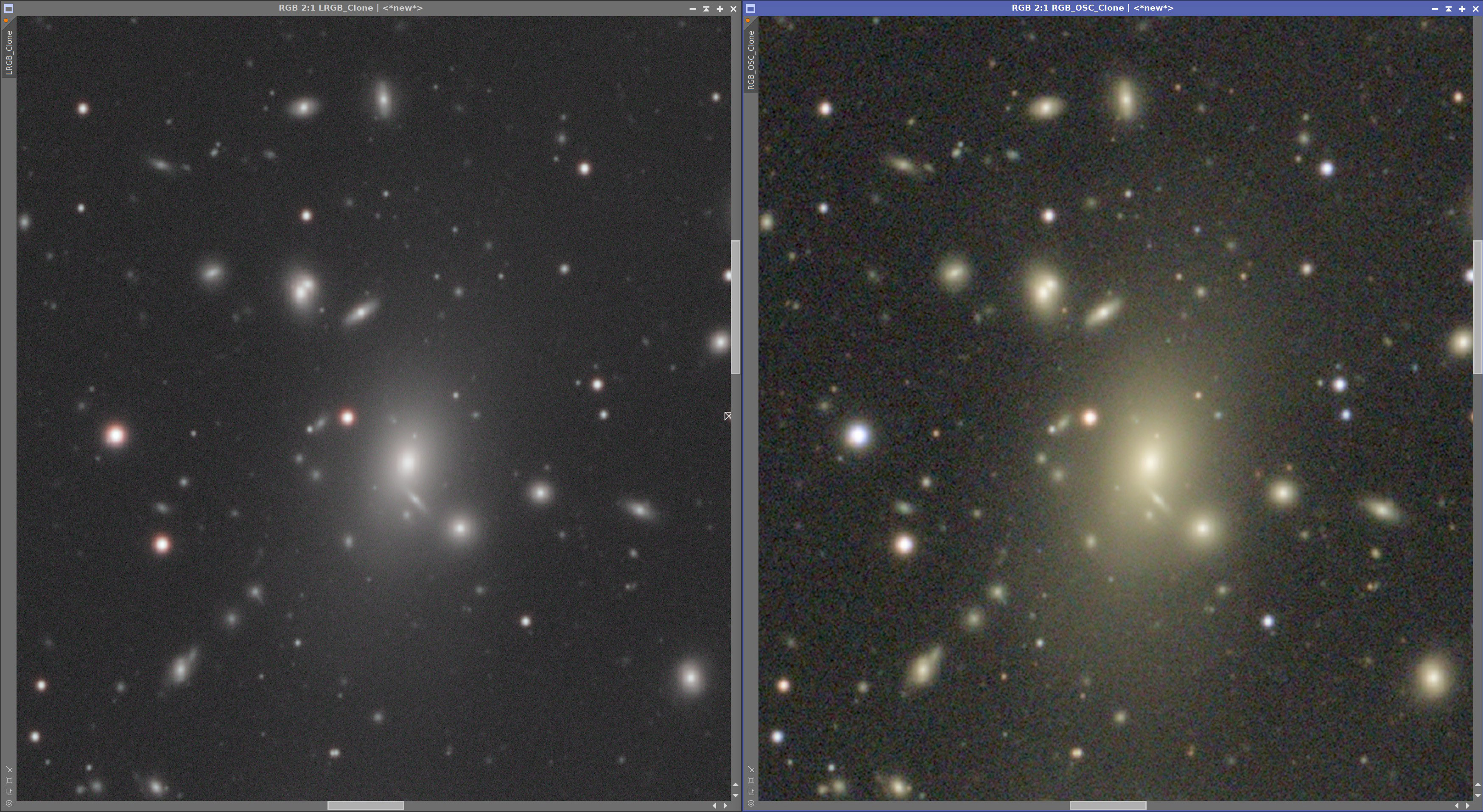Farblich zeigen sich ebenfalls Unterschiede. Die OSC wirkt in der Darstellung etwas kräftiger, während die LRGB Variante insgesamt etwas nüchterner erscheint. Zudem wirkt das Rauschen bei der OSC etwas präsenter und gröber.