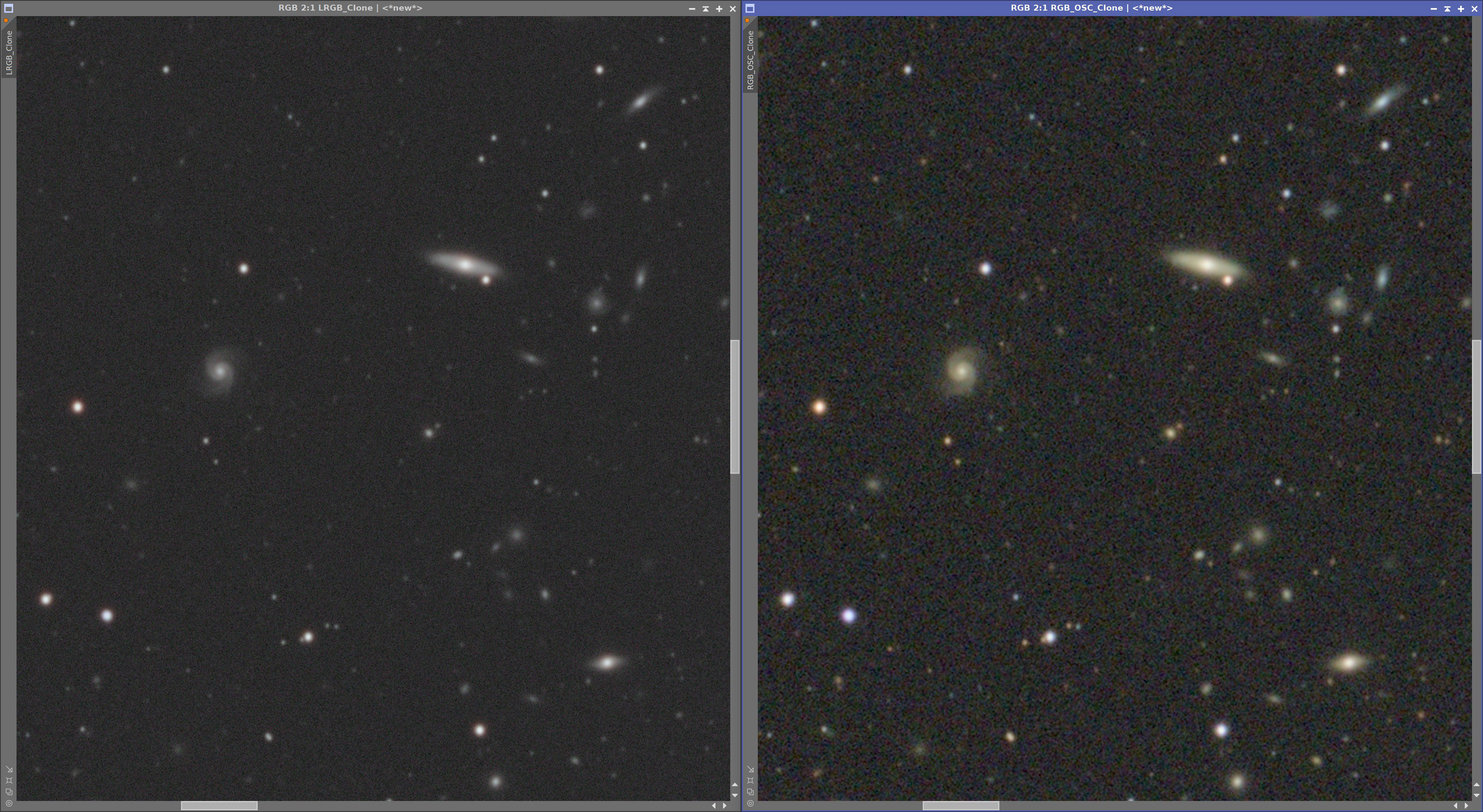 Im direkten Vergleich zeigt die großpixelige OSC bei den kleinen Galaxien erstaunlich ähnliche Details wie die Mono Variante. Die Unterschiede sind vorhanden, aber deutlich kleiner, als ich es im Vorfeld erwartet hätte.