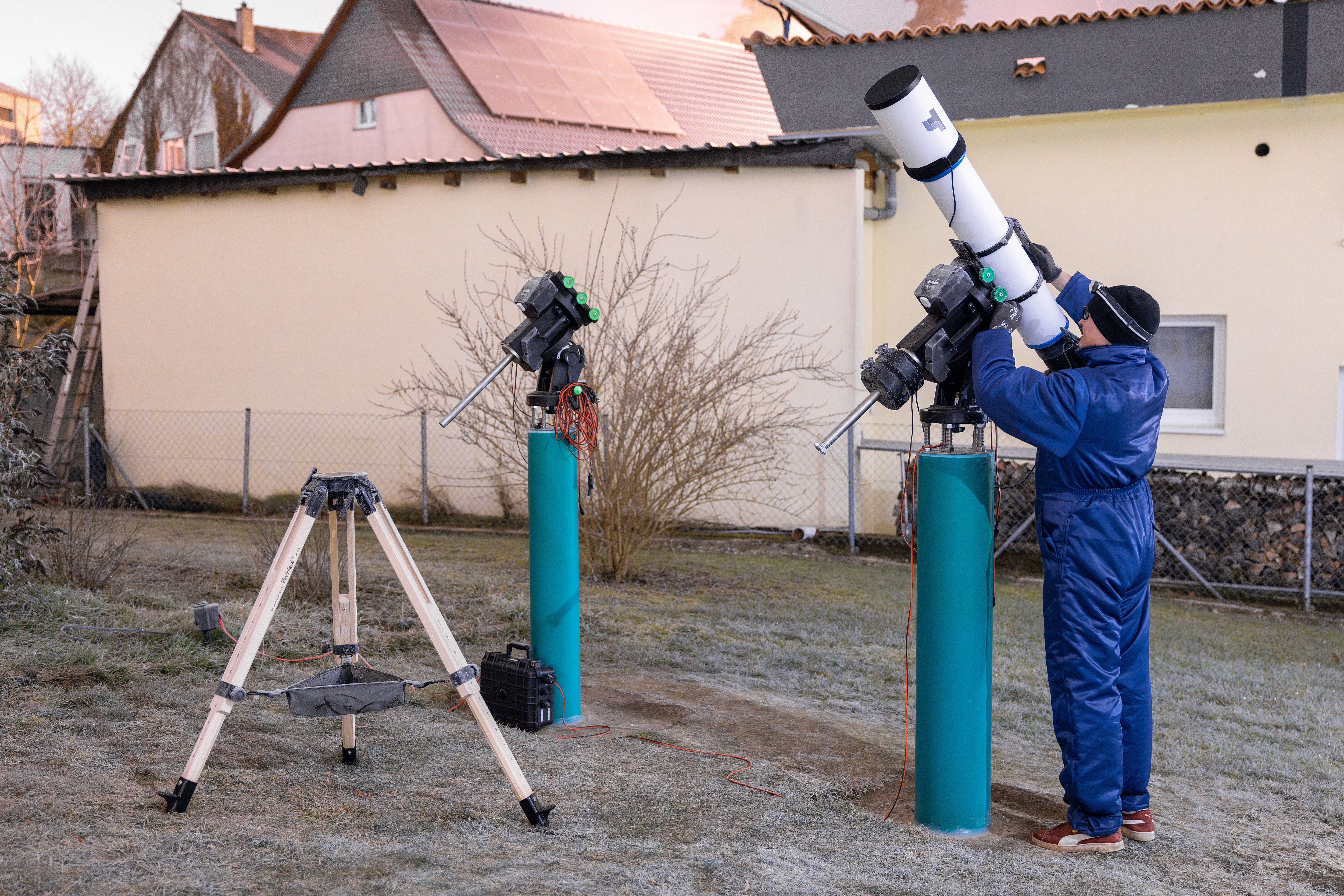 Aus früheren Jahren hatte ich noch sehr gute Erinnerungen an einen hochwertigen Thermo-Overall, den ich während meiner Tätigkeit als Fahrer eines Zehn-Tonnen-Staplers im dauerhaften Außeneinsatz getragen habe. Das Kleidungsstück war bequem, robust und vor allem praktisch. Diese Erfahrung war letztlich der Auslöser für die Suche nach einem ähnlichen Konzept für die Astronomie. Ein einteiliger Overall erschien mir deutlich sinnvoller als eine Kombination aus Thermohose und Jacke. Ein Reißverschluss, ein Kleidungsstück, Kapuze aufsetzen, in die Schuhe schlüpfen und wieder hinaus in die Kälte. Alles aus einem Guss, ausreichend warm, beweglich und mit einer Oberfläche, die Feuchtigkeit nicht sofort aufsaugt, insbesondere im Kniebereich.