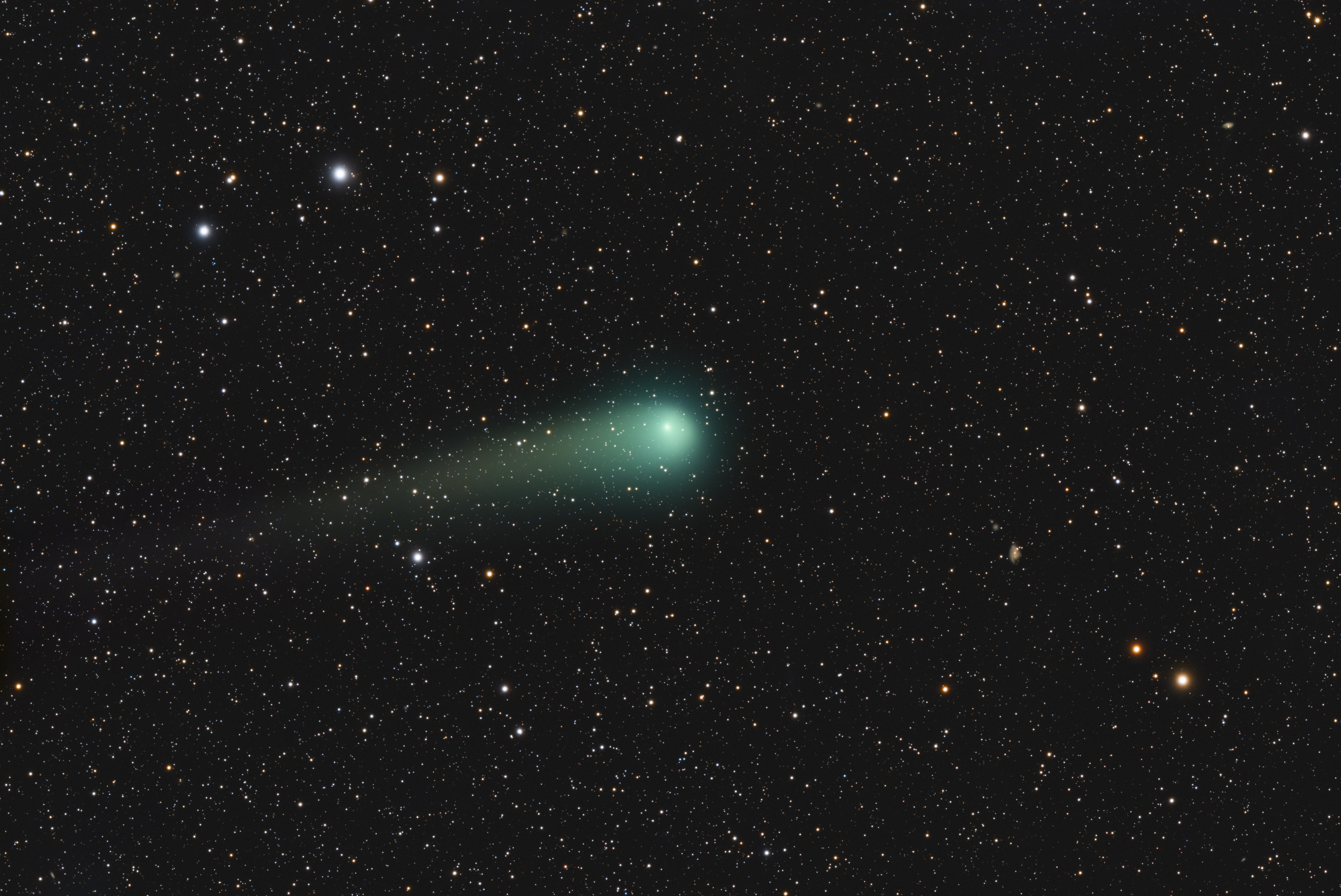 Auf meinen Aufnahmen ist eine deutlich grünliche Koma zu erkennen. Diese typische Färbung entsteht durch zwei Moleküle, die häufig in Kometenkoma auftreten. Diese grünliche Färbung entsteht hauptsächlich durch zweiatomigen Kohlenstoff (C₂), der durch Sonnenstrahlung angeregt wird und charakteristische Emissionslinien im grünen Spektralbereich erzeugt.