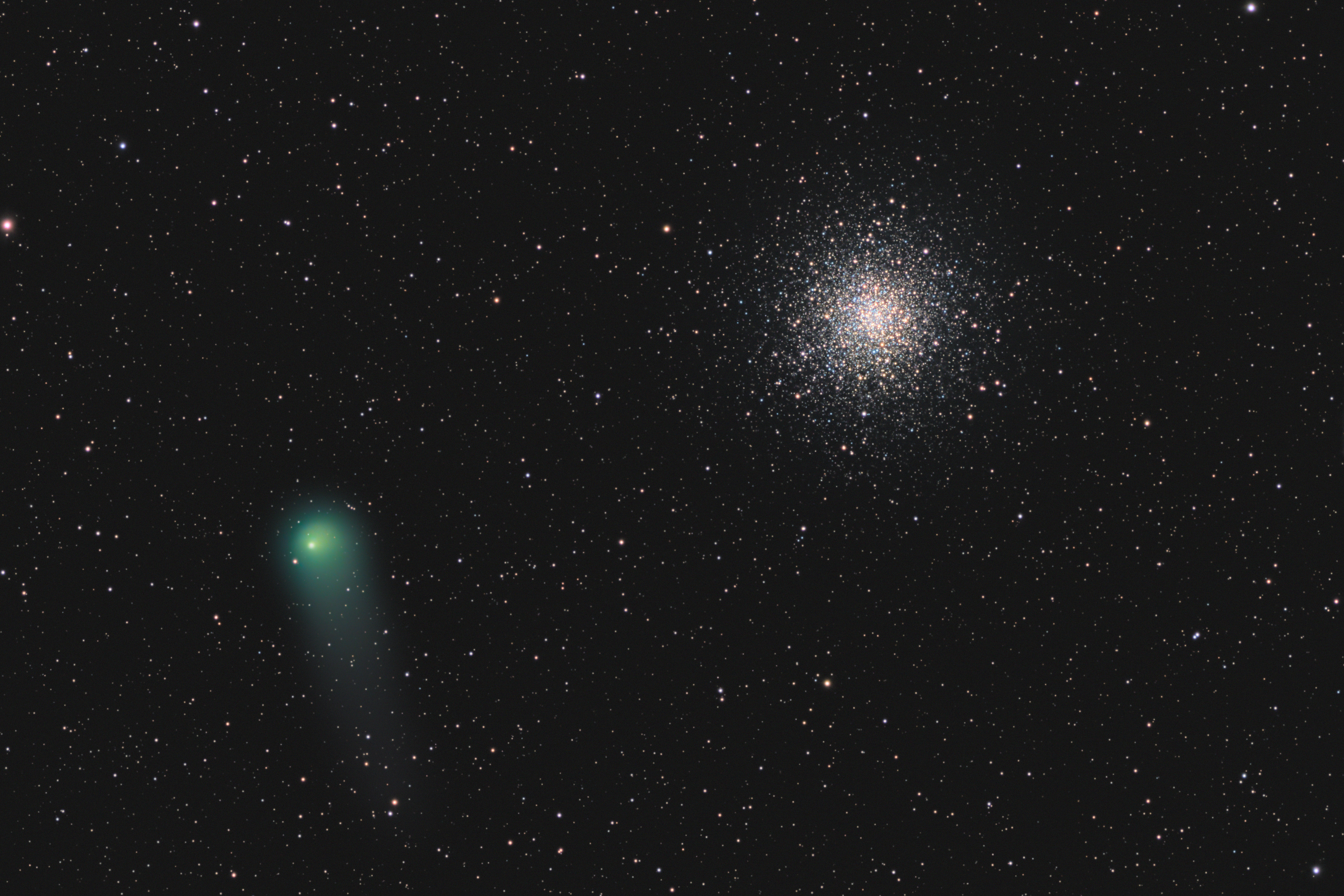 Die scheinbare Nähe der beiden Objekte ist natürlich nur eine Perspektivwirkung. Während der Komet ein vergleichsweise kleines Objekt innerhalb unseres Sonnensystems ist, befindet sich M10 tief im Halo unserer Milchstraße. Gerade dieser enorme Größen und Entfernungsunterschied macht solche Begegnungen astrophotografisch besonders reizvoll.