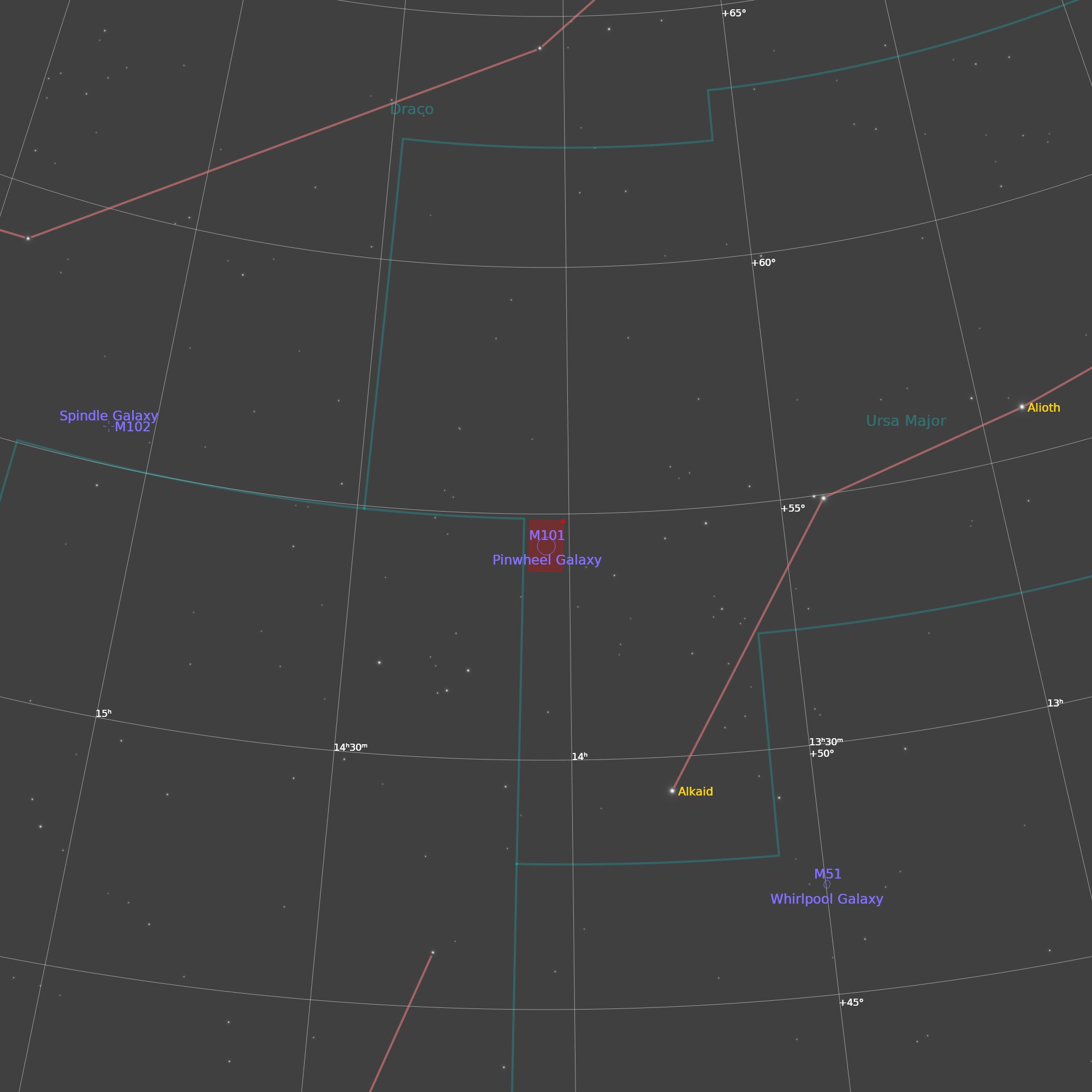 Messier 101 liegt nordöstlich des Sterns Alkaid im Großen Wagen und ist von mitteleuropäischen Breiten aus gut erreichbar. Aufgrund ihrer geringen Flächenhelligkeit ist sie visuell anspruchsvoll, fotografisch jedoch sehr lohnend.