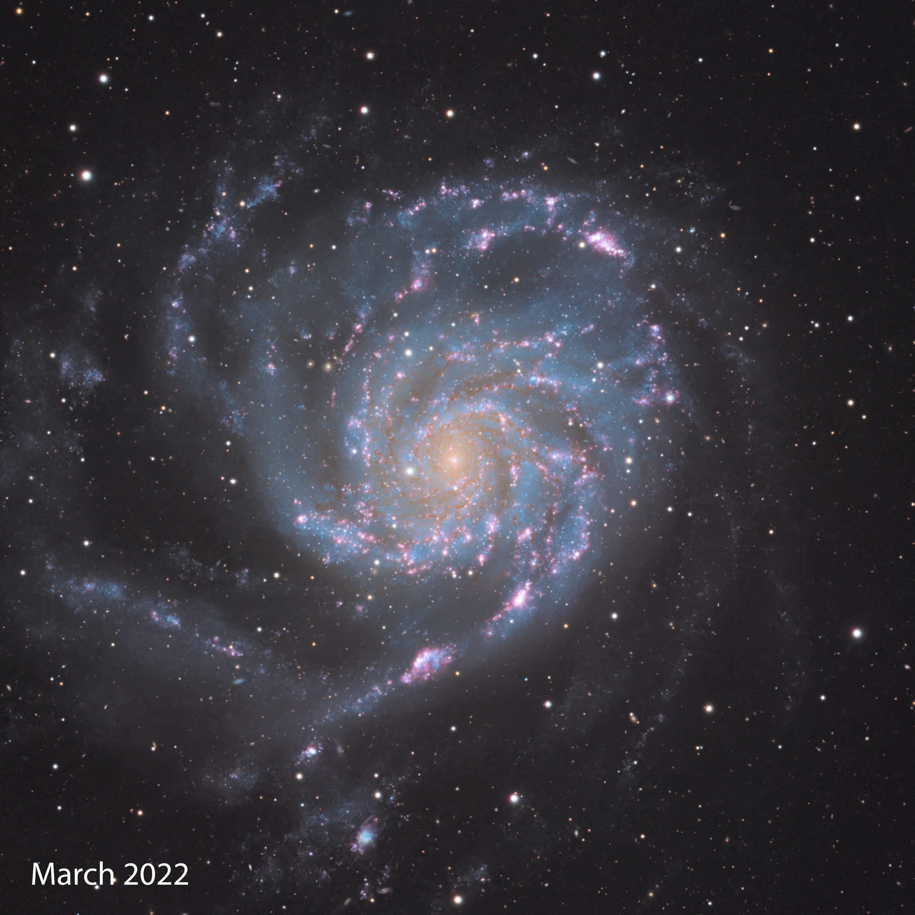 Messier 101 gehört zu den eindrucksvollsten Spiralgalaxien des lokalen Universums und zeichnet sich durch weit ausladende Spiralarme mit ausgeprägter Sternentstehung aus.