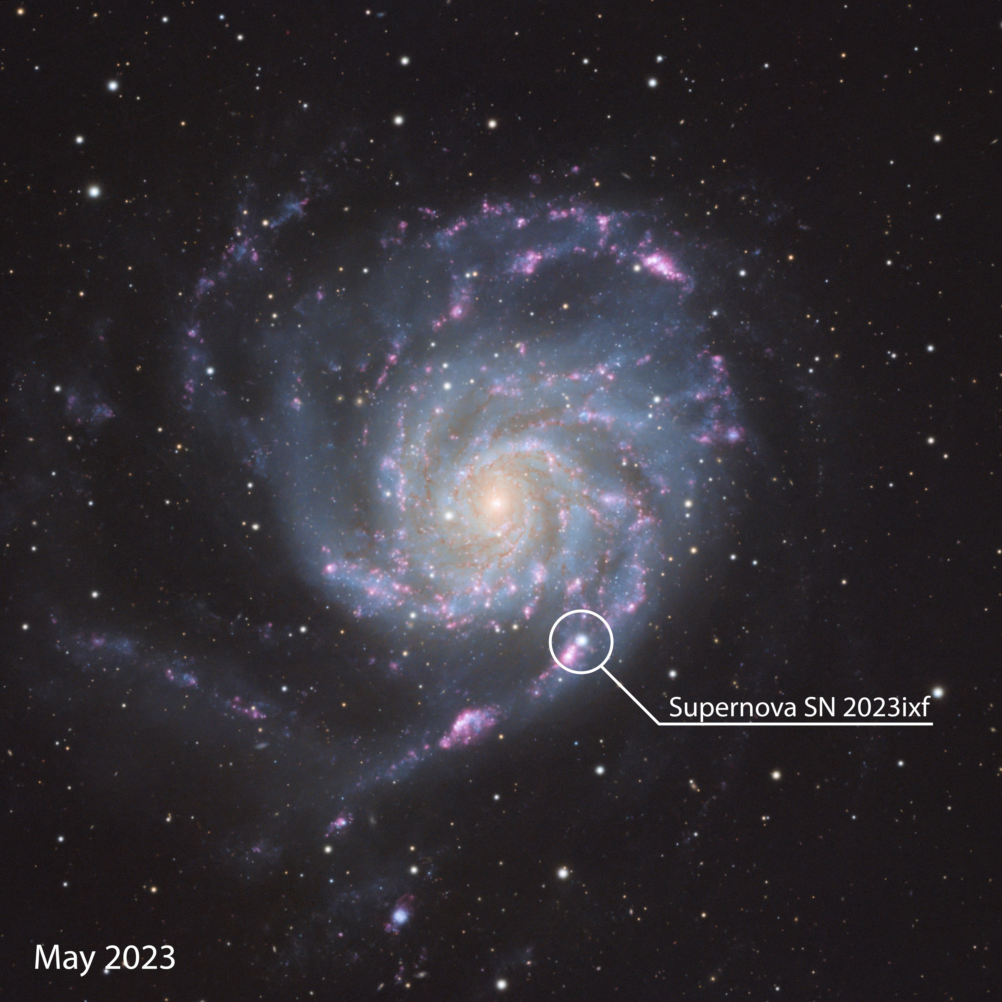 Ein besonders anschaulicher Aspekt ergibt sich aus dem Vergleich zweier Aufnahmen aus unterschiedlichen Jahren. Während in der Aufnahme aus März 2022 an der späteren Explositionsposition keine auffällige Struktur zu erkennen ist, erscheint dort in der Aufnahme aus Mai 2023 plötzlich ein deutlich heller Lichtpunkt. Dabei handelt es sich um die Supernova SN 2023ixf, die im Mai 2023 in Messier 101 entdeckt wurde.