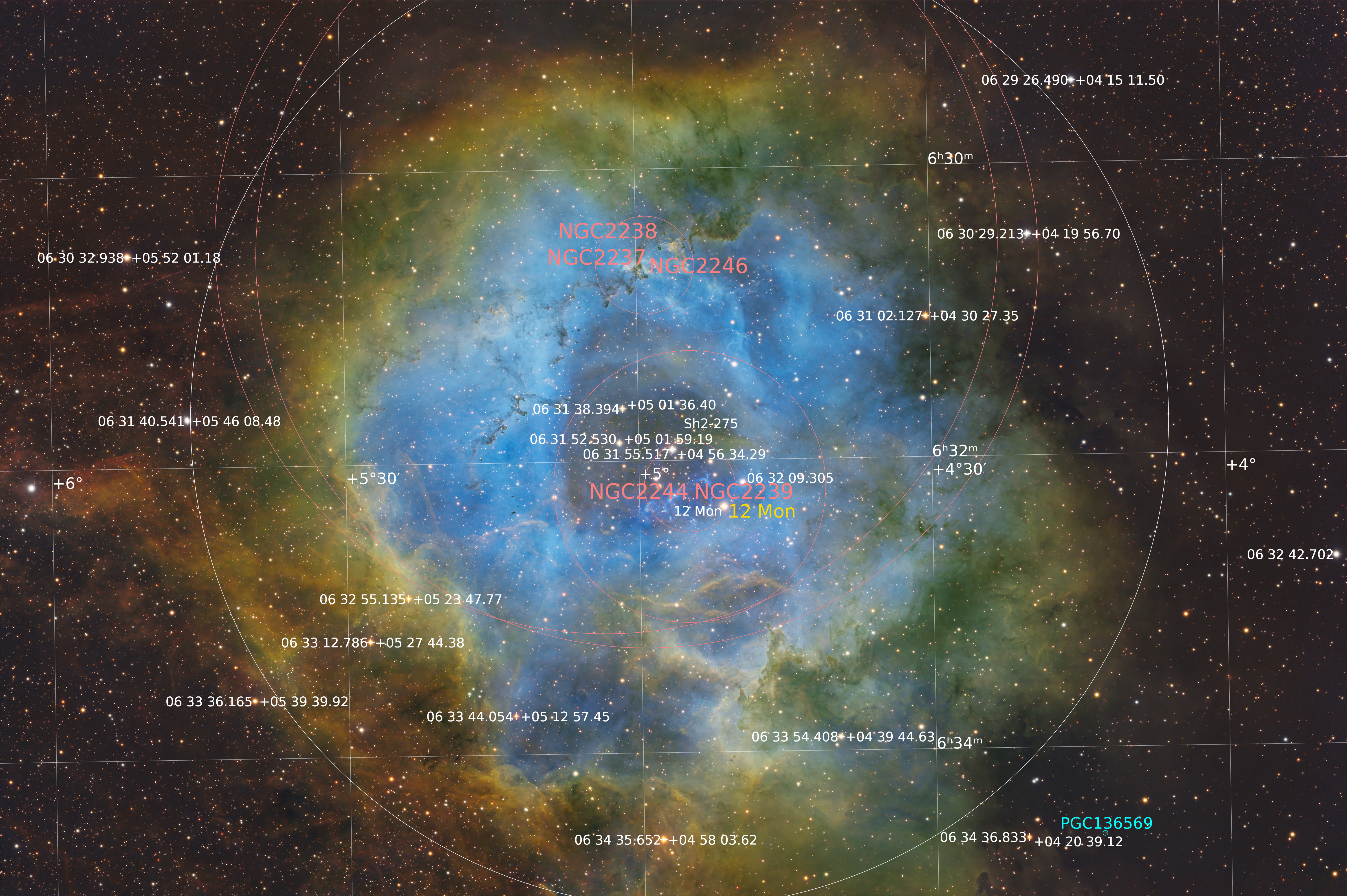 Der Rosettennebel liegt im Sternbild Einhorn nahe der Grenze zu den Zwillingen und gehört zur äußeren Region des Orion-Arms unserer Milchstraße. Mit einer Entfernung von rund 5.000 Lichtjahren ist er Teil eines größeren Komplexes aktiver Sternentstehung, zu dem auch weitere Emissionsnebel und junge Sternhaufen gehören.