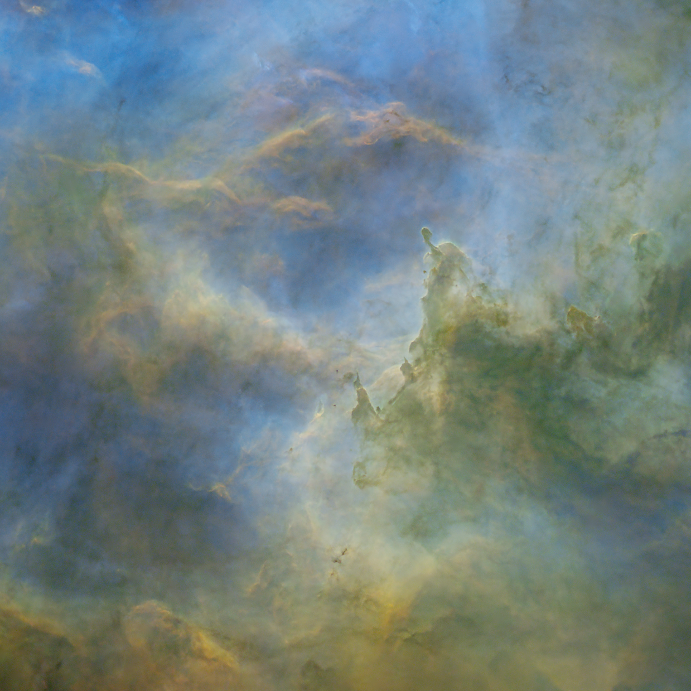 Um die unterschiedlichen Gasbestandteile unterscheiden zu können, werden die einzelnen Emissionslinien künstlichen Farben zugeordnet. In dieser Darstellung steht Schwefel-II (SII) für warme Gold- und Orangetöne, Wasserstoff-alpha (Hα) für Grün und Sauerstoff-III (OIII) für Blau- und Cyanfarben.