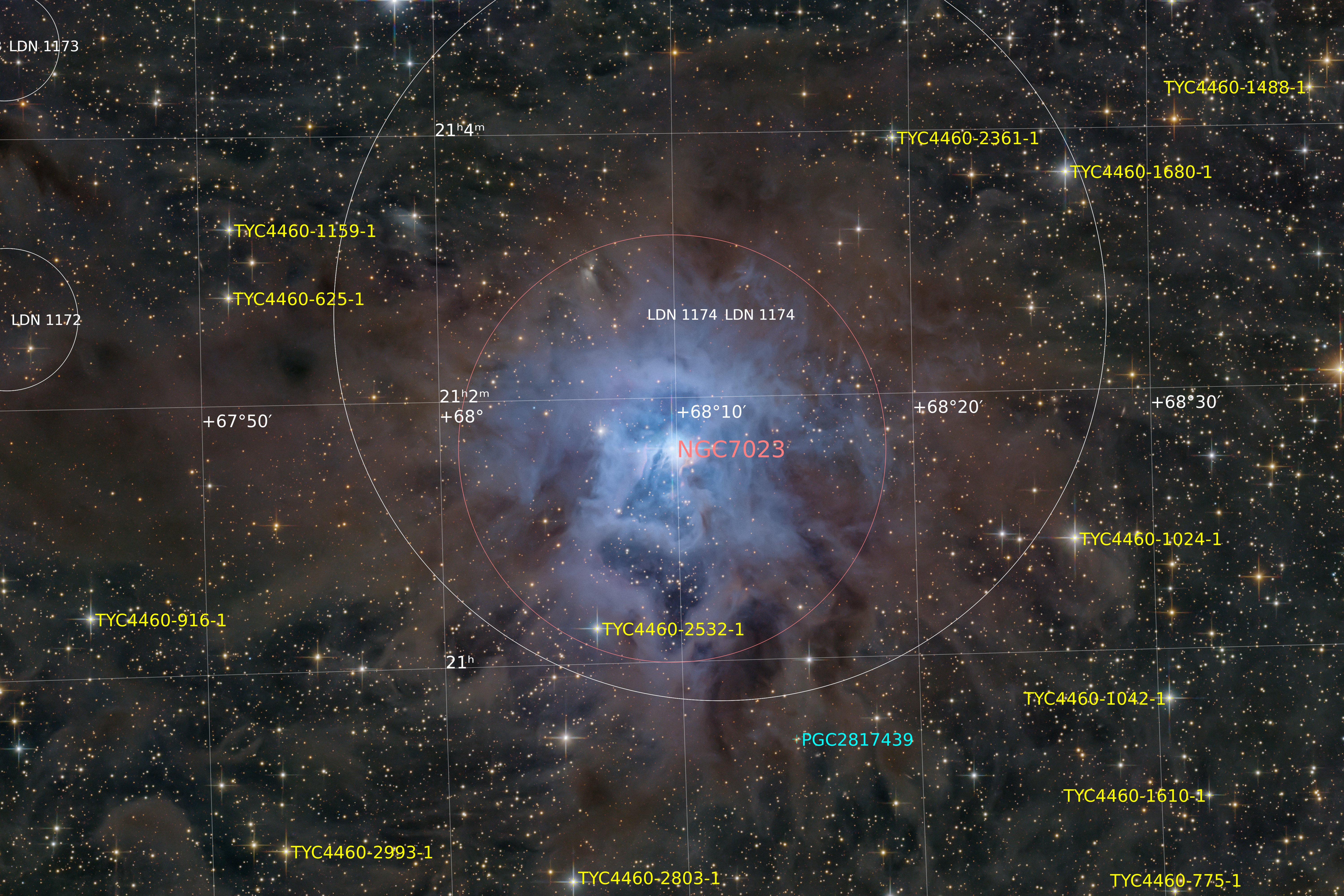 Der Irisnebel, katalogisiert als NGC 7023, ist ein sogenannter Reflexionsnebel im Sternbild Kepheus. Er befindet sich in einer Entfernung von etwa 1.300 Lichtjahren und zählt zu den eindrucksvollsten Beispielen dafür, wie interstellarer Staub durch Sternlicht sichtbar gemacht wird. Anders als viele bekannte Nebel leuchtet er nicht aus sich selbst, sondern erscheint nur durch die Beleuchtung eines einzelnen Sterns.