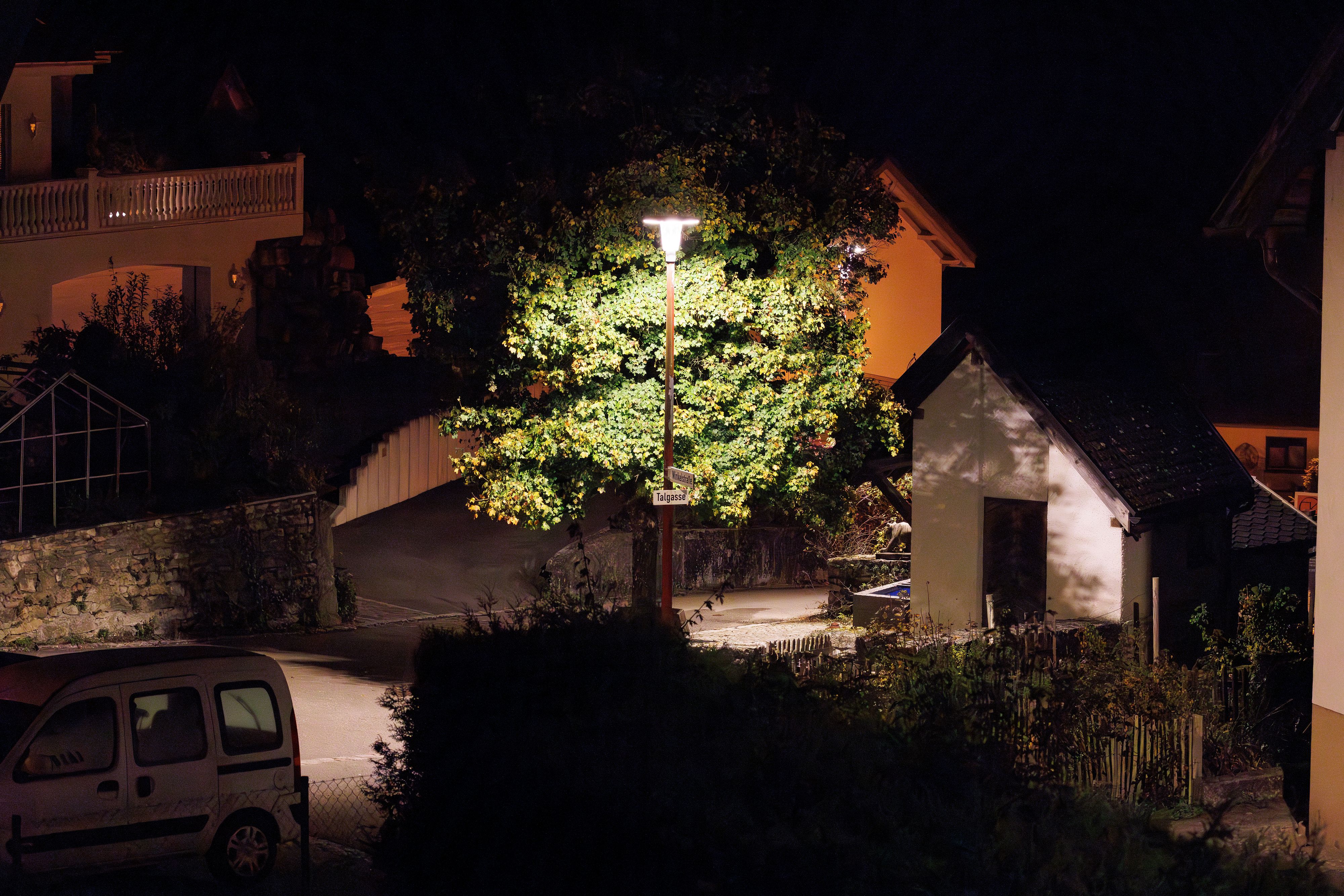 Aufgrund meiner Beanstandung wurde die Straßenlaterne im Rahmen einer Modernisierung durch eine LED-Lampe ersetzt. Diese neue LED-Lampe hat einen etwas schmaleren Lichtkegel, wodurch weniger Licht auf das Grundstück gestreut wird. Dennoch bleibt die Ausleuchtung weiterhin relativ hell, wie auf dem folgenden Foto zu sehen ist.