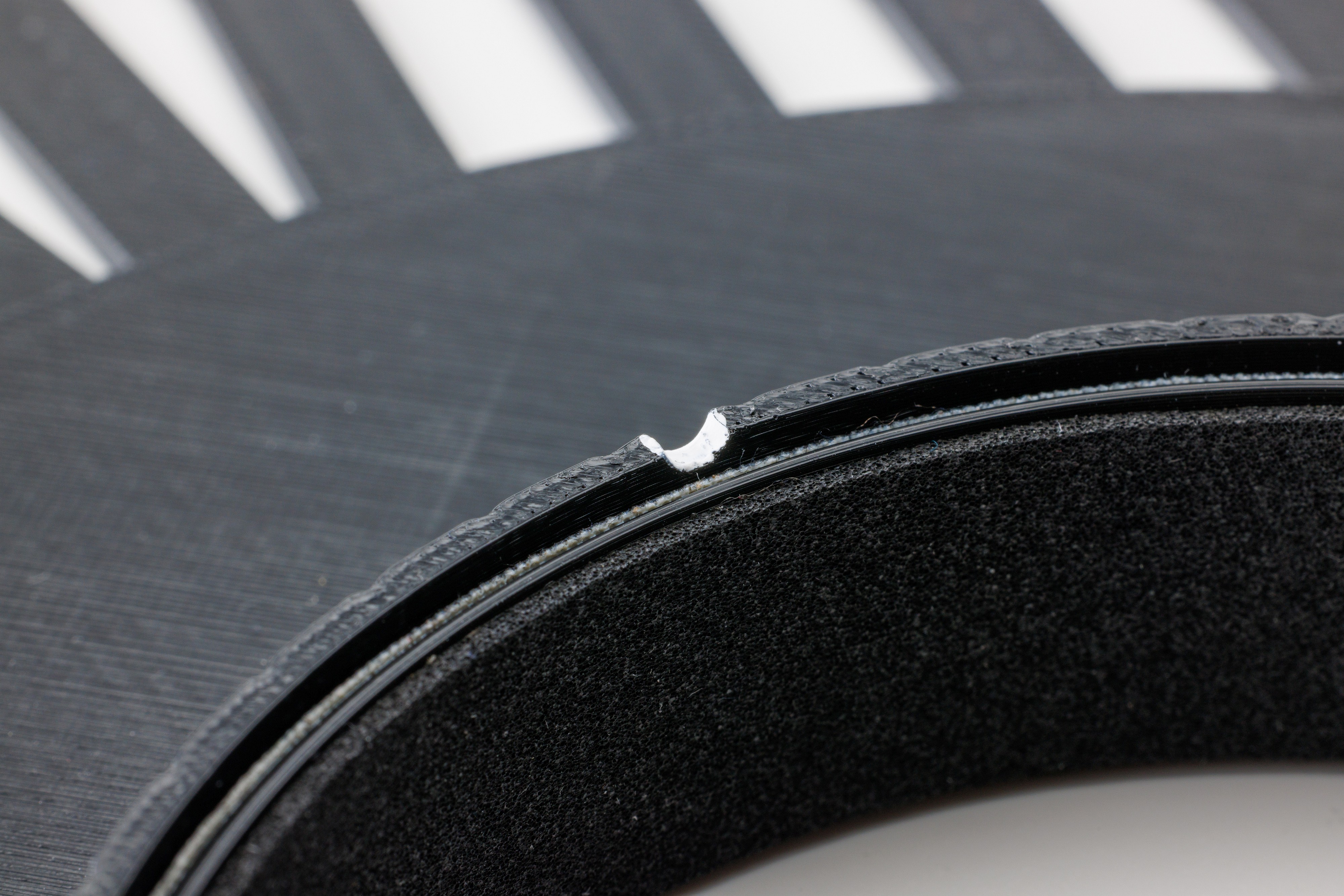 Das Bild zeigt hier aber auch ganz gut, dass der Heizring zwei Anschlüsse am Rand bietet, jeweils für die Heizung selbst, und für einen Temperatursensor. Den Anschluss für den Sensor habe ich mittlerweile entfernt, aber der Anschluss für den Heizring bleibt bestehen. Das bringt das Problem mit sich, dass eine normale Maske nicht sauber aufgesetzt werden kann.