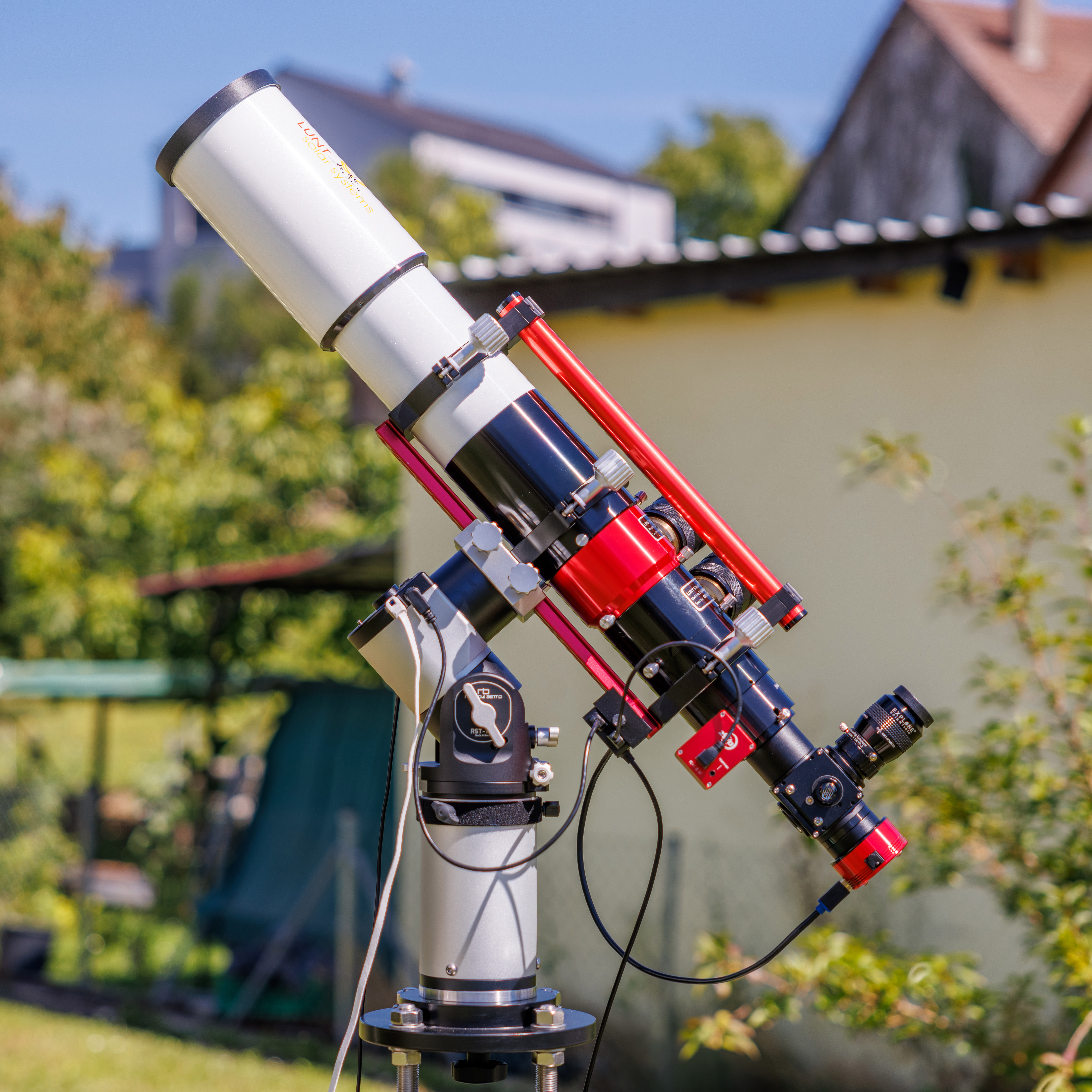 Bei meinem Lunt 100 Sonnenteleskop habe ich beispielsweise einen USB-Hub direkt am Teleskop montiert. Die Befestigung erfolgt über eine von mir gedruckte Prismenklemme, sodass der Hub fest, stabil und positionsgenau sitzt. Über diesen zentralen Punkt führe ich die Kamera, den Fokusmotor sowie die Montierung zusammen. Ab diesem Punkt verlässt dann nur noch ein einziges USB-Kabel das Teleskop in Richtung Notebook oder PC.