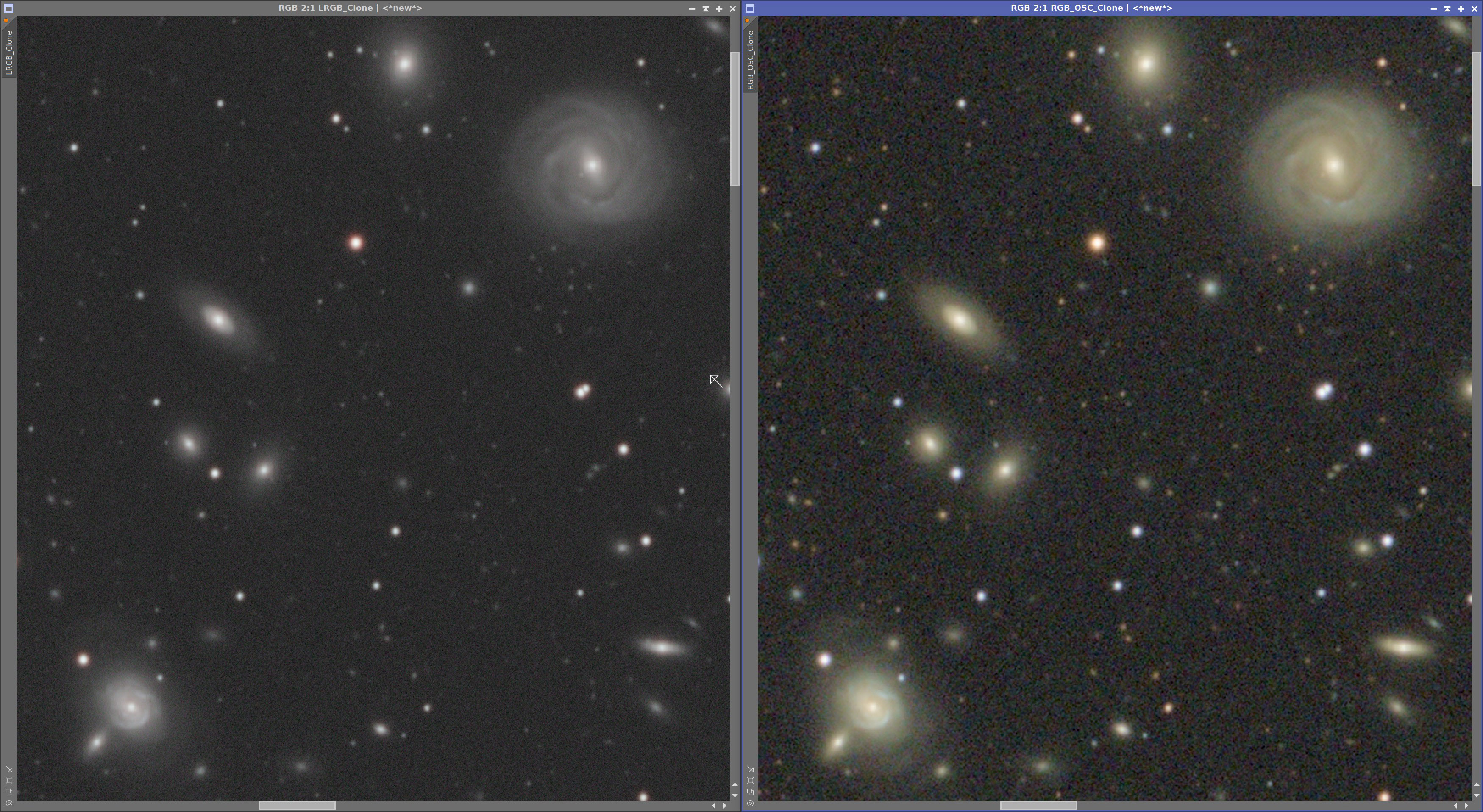 Im direkten Vergleich zeigt die großpixelige OSC bei den kleinen Galaxien erstaunlich ähnliche Details wie die Mono Variante. Die Unterschiede sind vorhanden, aber deutlich kleiner, als ich es im Vorfeld erwartet hätte.