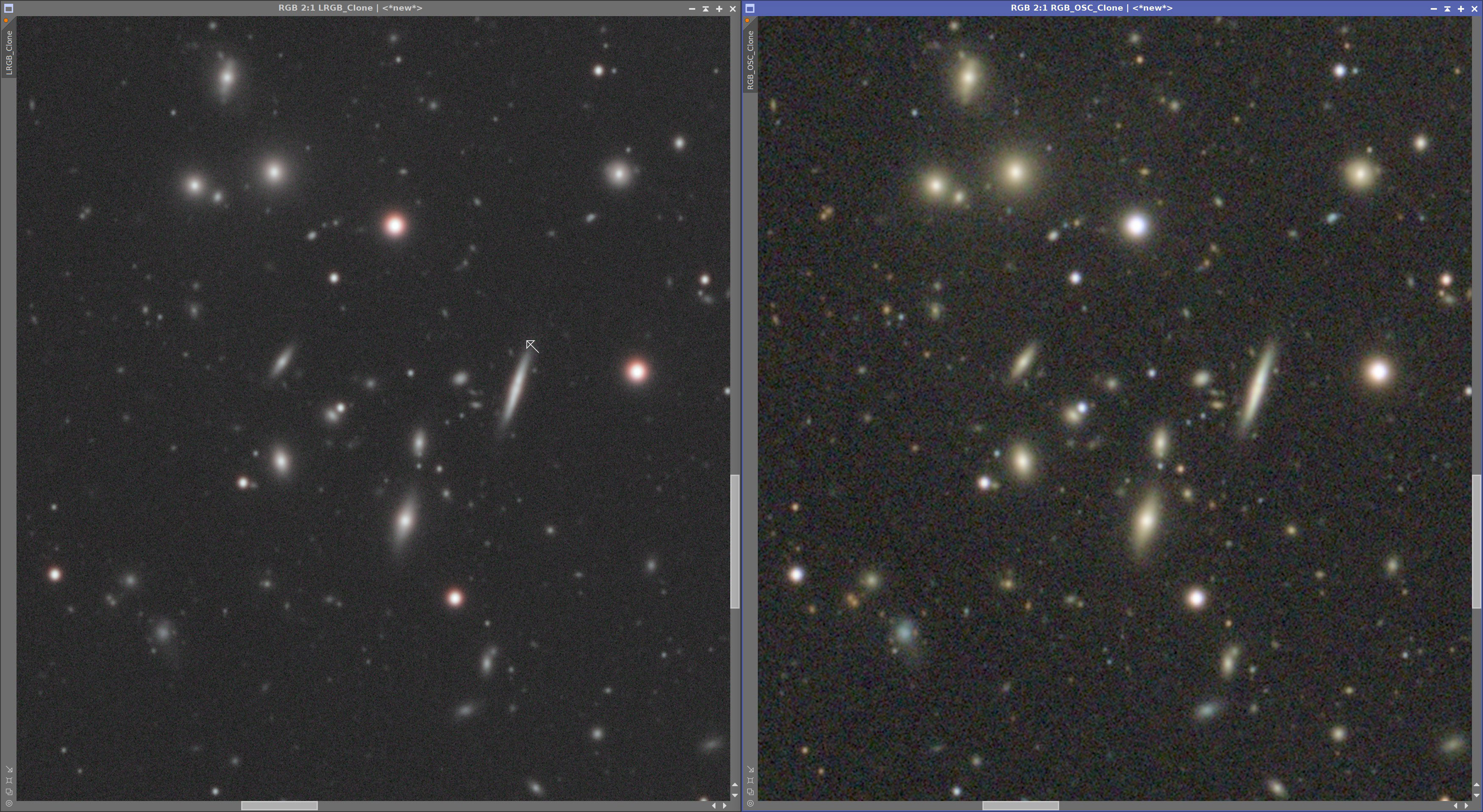 Farblich zeigen sich ebenfalls Unterschiede. Die OSC wirkt in der Darstellung etwas kräftiger, während die LRGB Variante insgesamt etwas nüchterner erscheint. Zudem wirkt das Rauschen bei der OSC etwas präsenter und gröber.