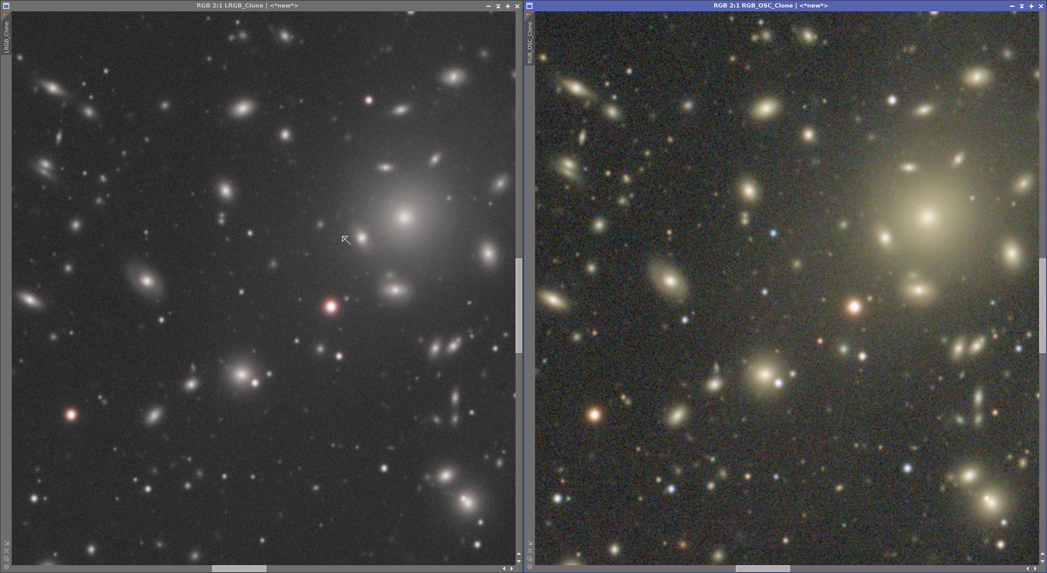 Auf alle Daten wurde lediglich GradientCorrection angewendet. Die RGB Kanäle der Mono Aufnahme wurden per LinearFit angeglichen und anschließend mit LRGBCombination kombiniert. Danach erfolgte bei beiden Varianten die Farbkalibrierung mit SPCC. Abschließend wurden beide Bilder mit den Standardeinstellungen von MaskedStretch gestretcht. Auf weitere Maßnahmen wie Dekonvolution, Entrauschung oder gezielte Detailverstärkung habe ich bewusst verzichtet.