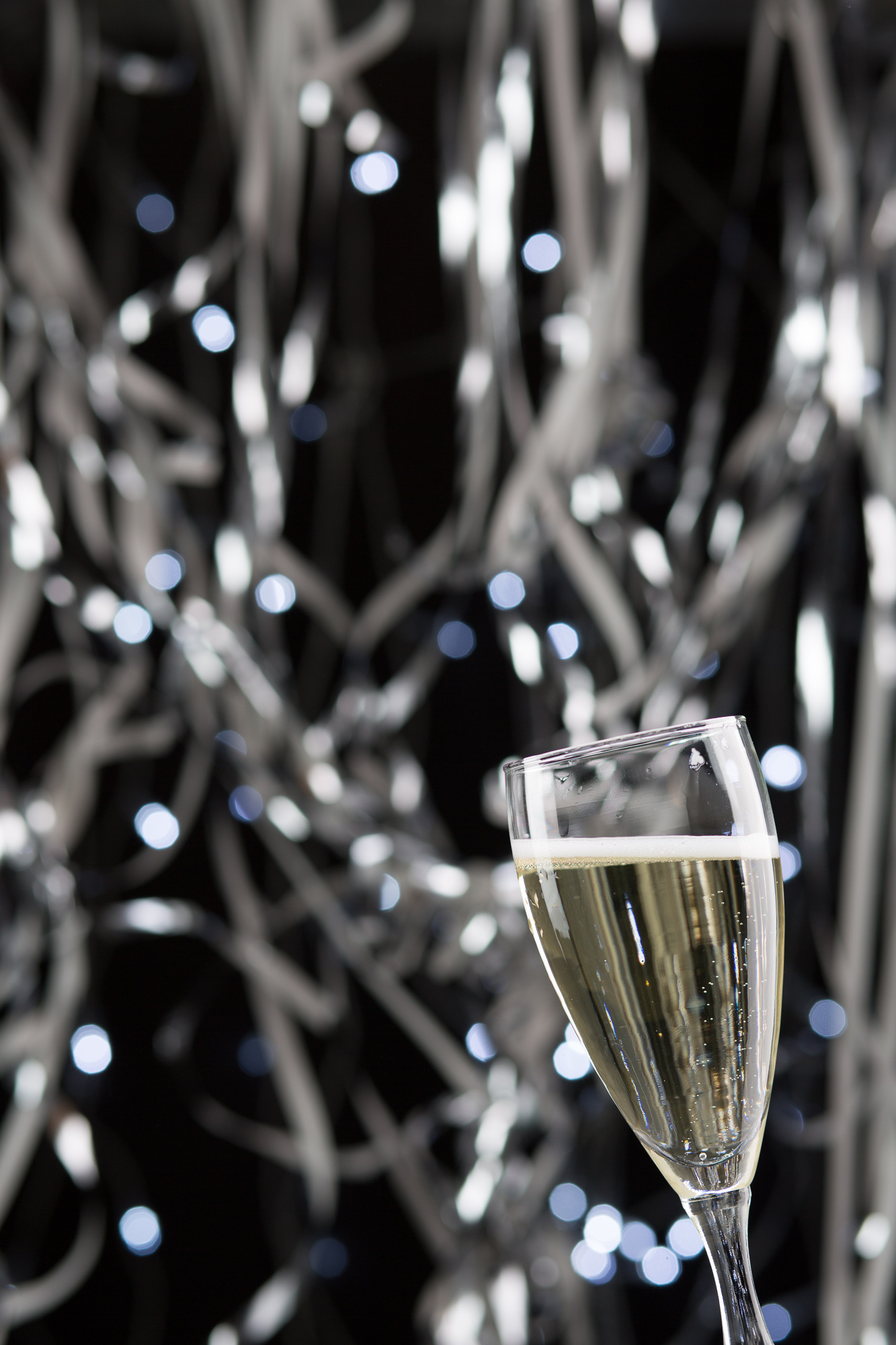Das ganze erschien mir doch etwas zu schlicht nach dem ersten Aufbau, und eine Sektflasche ohne einen goldenen Kragen erschien mir dann doch recht langweilig. Als Eis dienten künstliche Deko Eiswürfel aus Glas. Der Rauch stammte aus meiner E-Zigarette. Jedenfalls war das ganze wie erwähnt zu schlicht und musste mehr ausgeschmückt werden. Und da habe ich mit dem Hintergrund angefangen, der einfach zu dunkel war. Als Hintergrund wurden silberne Luftschlangen eingesetzt, sowie eine Lichterkette.