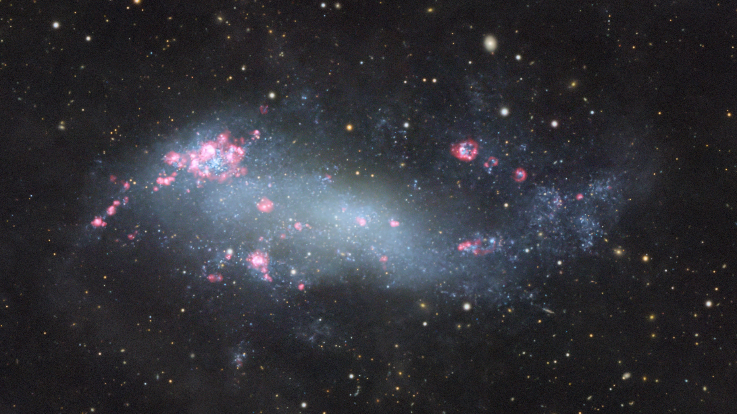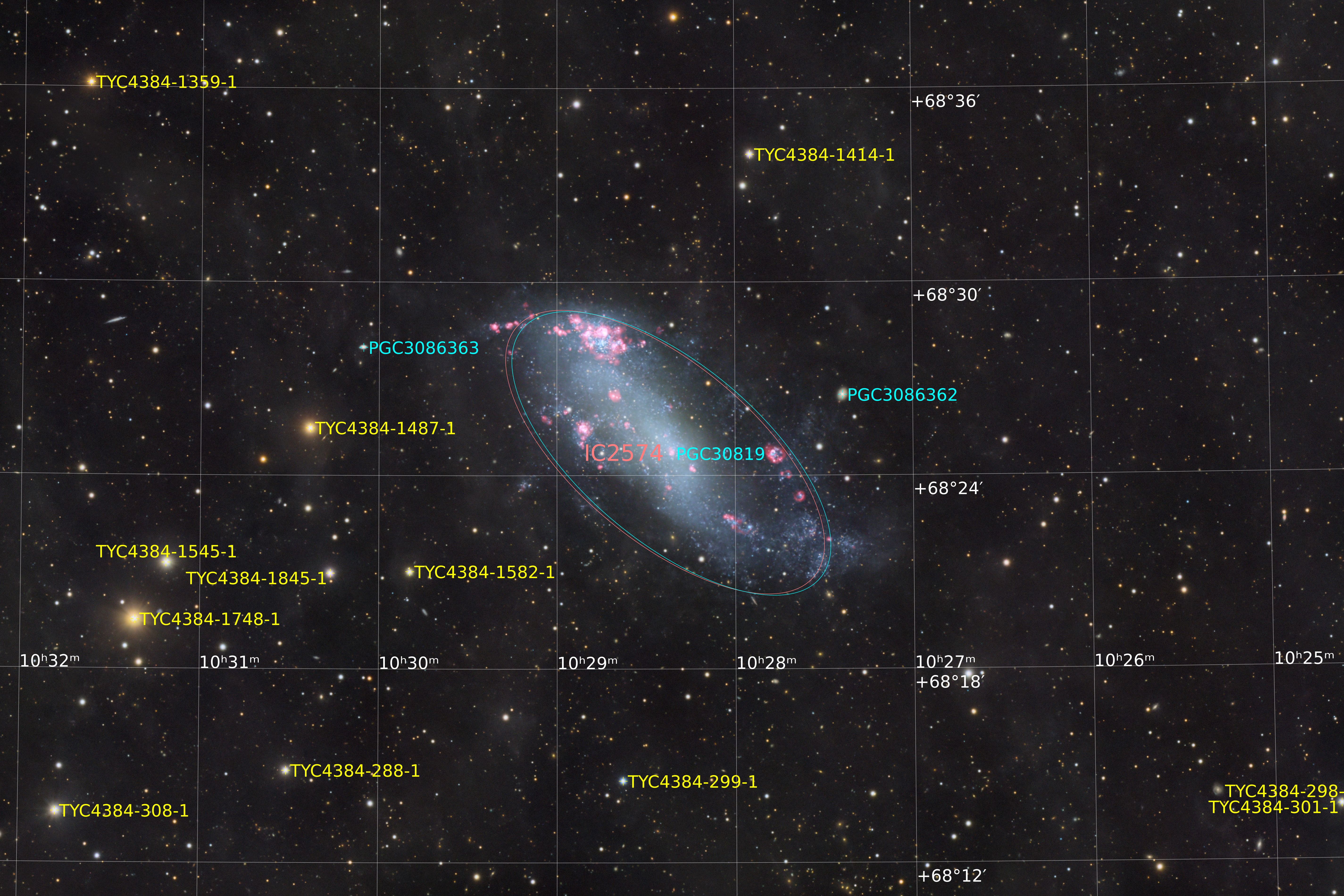 Die Kombination aus sehr langer RGB-Belichtungszeit und zusätzlicher H-alpha-Integration ermöglicht es, sowohl die jungen Sternentstehungsgebiete als auch die diffuse Grundstruktur dieser Galaxie sichtbar zu machen. IC 2574 ist damit kein spektakulär helles Objekt, sondern eines, das seine Details erst bei genauer Betrachtung und mit viel Geduld preisgibt.