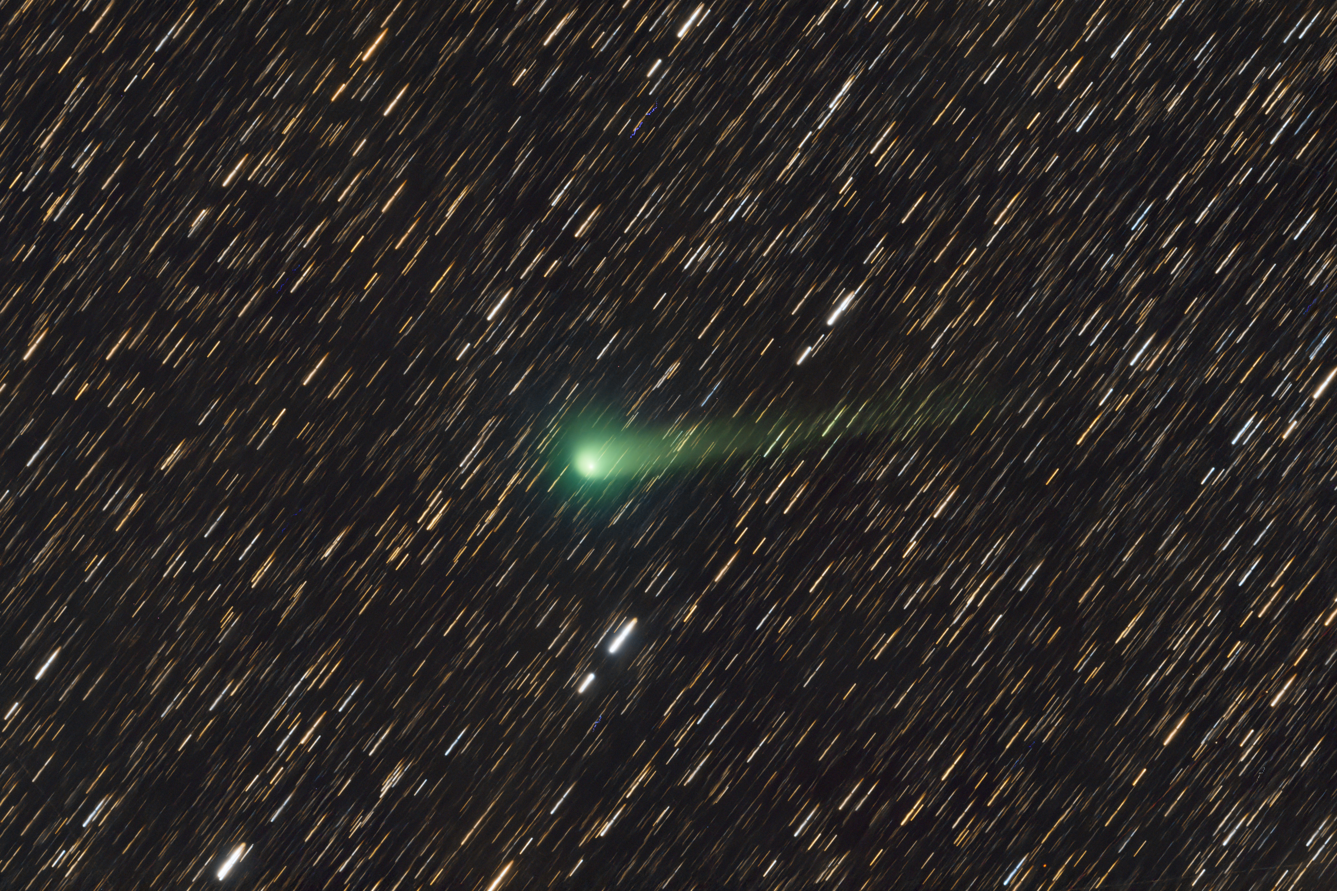 Auf meinen Aufnahmen ist eine deutlich grünliche Koma zu erkennen. Diese typische Färbung entsteht durch zwei Moleküle, die häufig in Kometenkoma auftreten. Diese grünliche Färbung entsteht hauptsächlich durch zweiatomigen Kohlenstoff (C₂), der durch Sonnenstrahlung angeregt wird und charakteristische Emissionslinien im grünen Spektralbereich erzeugt.
