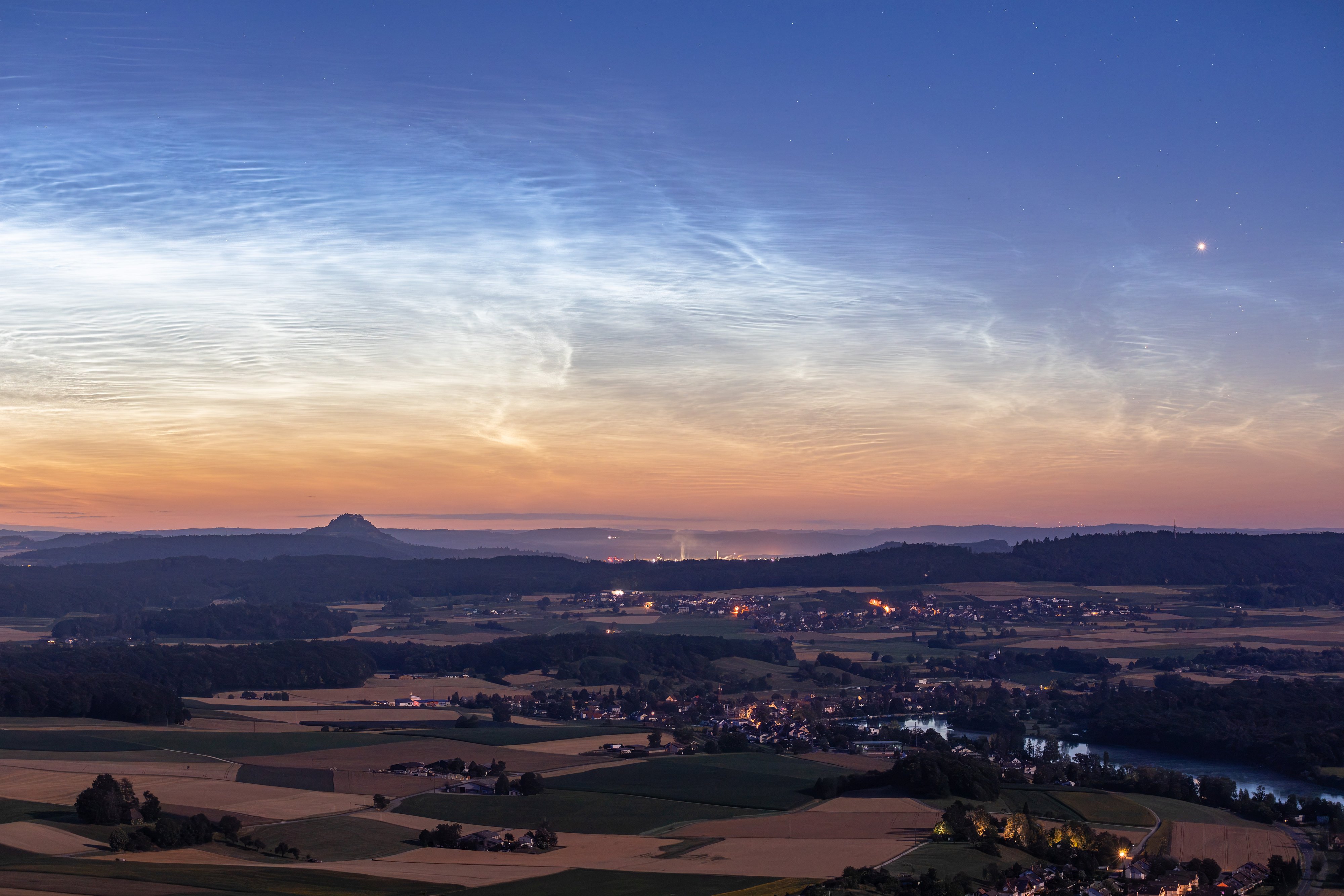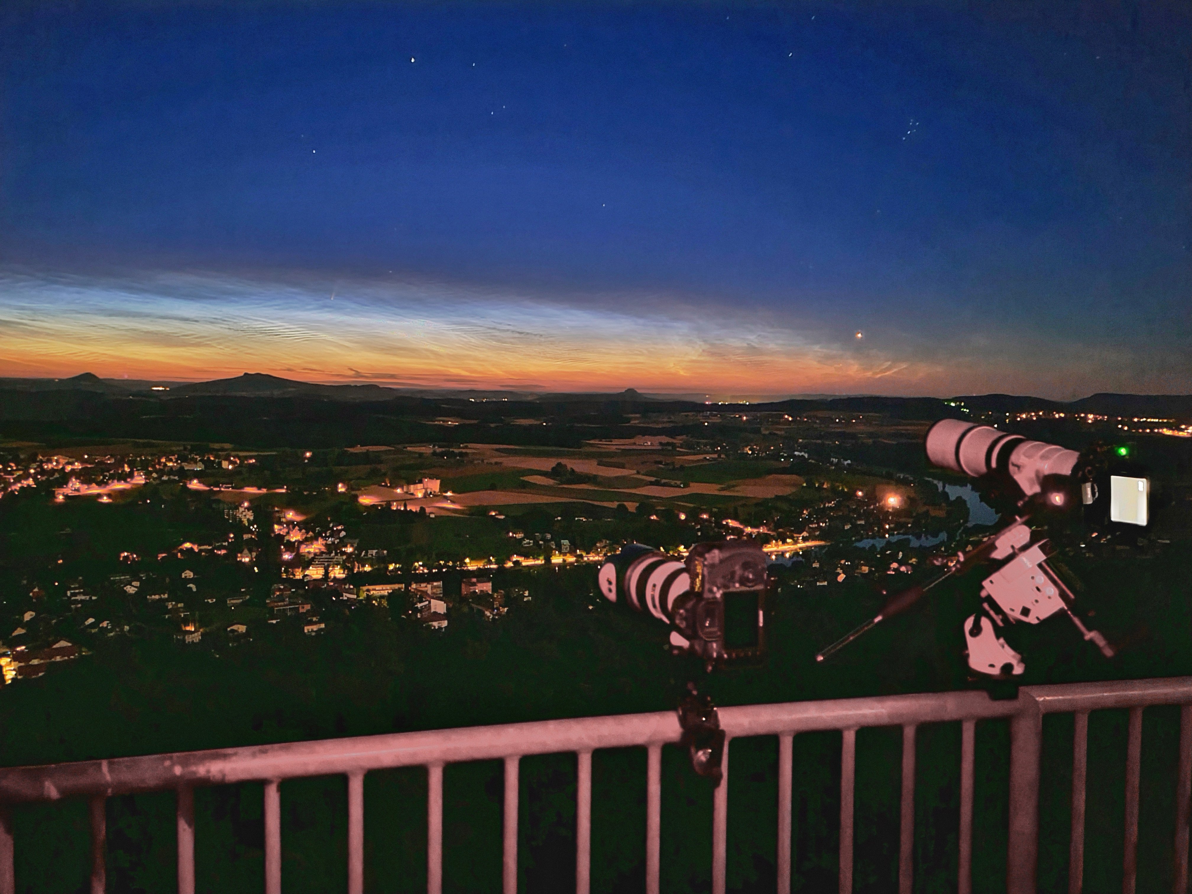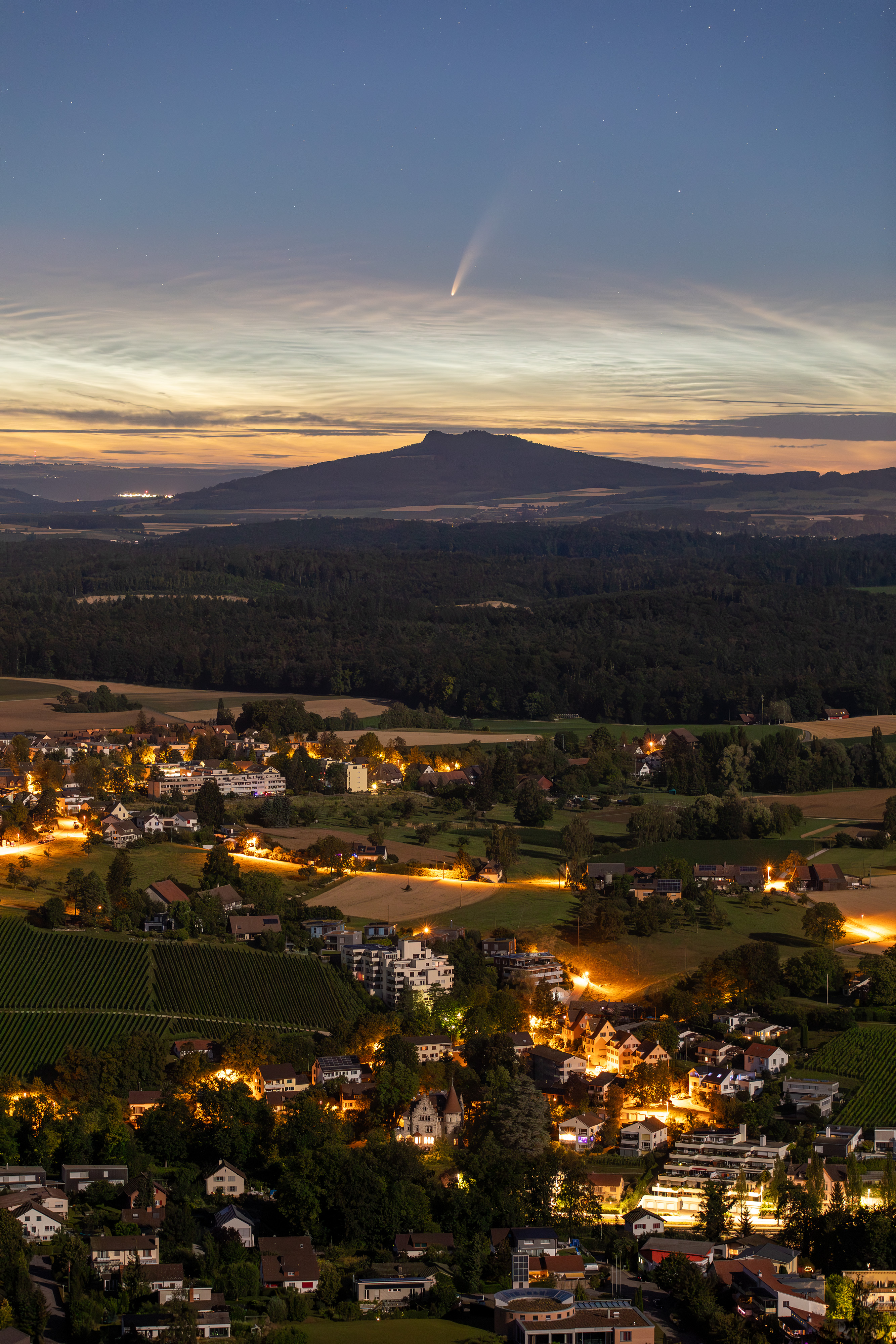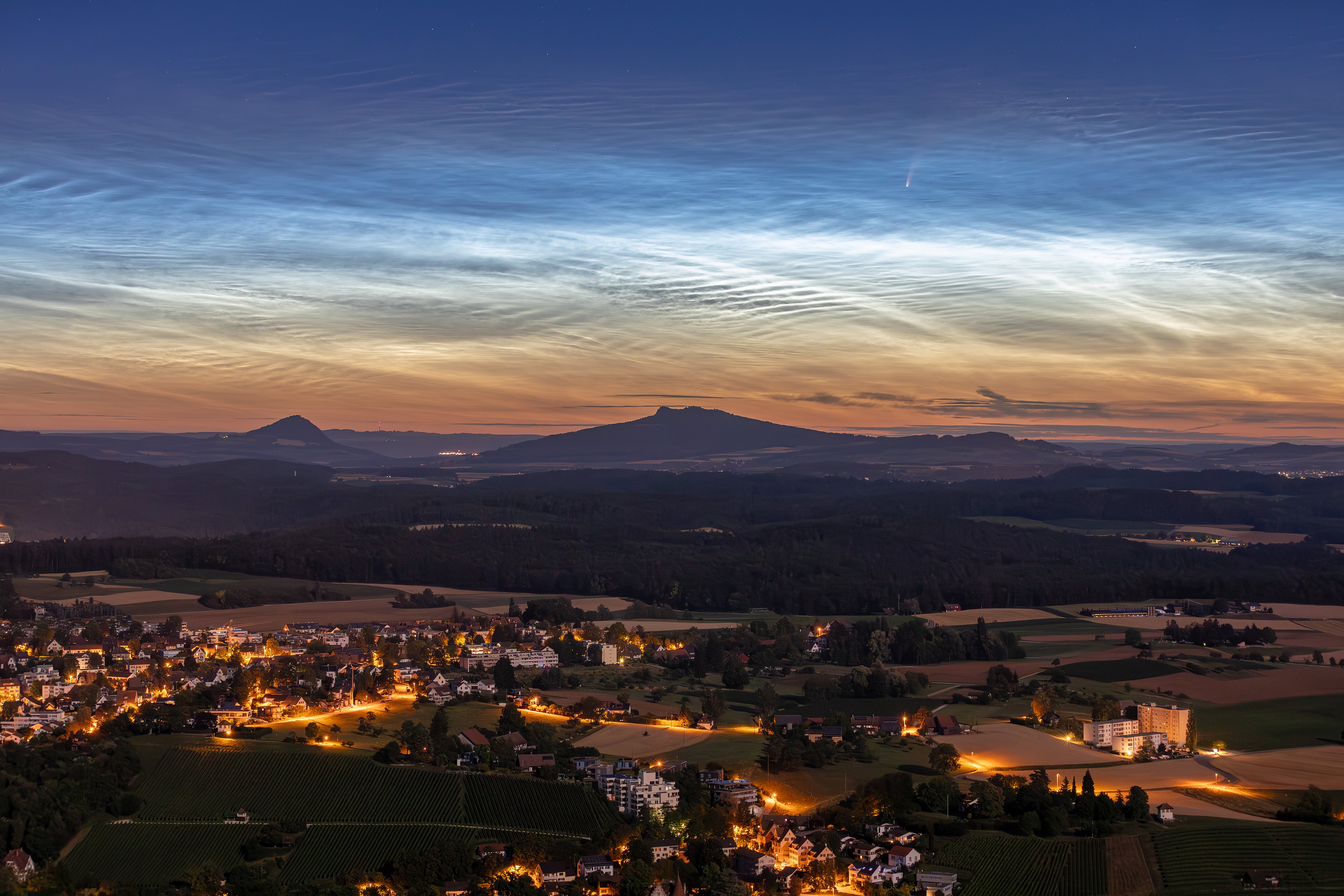 Das Erlebnis wurde noch einzigartiger durch das gleichzeitige Auftreten von leuchtenden Nachtwolken (noctilucent clouds). Diese extrem seltenen Wolken bilden sich in rund 80 Kilometern Höhe in der Mesosphäre, weit über den üblichen Wolkenschichten. Sie bestehen aus winzigen Eiskristallen, die das Sonnenlicht reflektieren, obwohl die Sonne längst unter dem Horizont steht. So entstanden silbrig-bläuliche Strukturen, die dem Himmel an diesem Morgen eine außergewöhnliche Textur verliehen und Neowise in eine mystische Kulisse einbetteten.