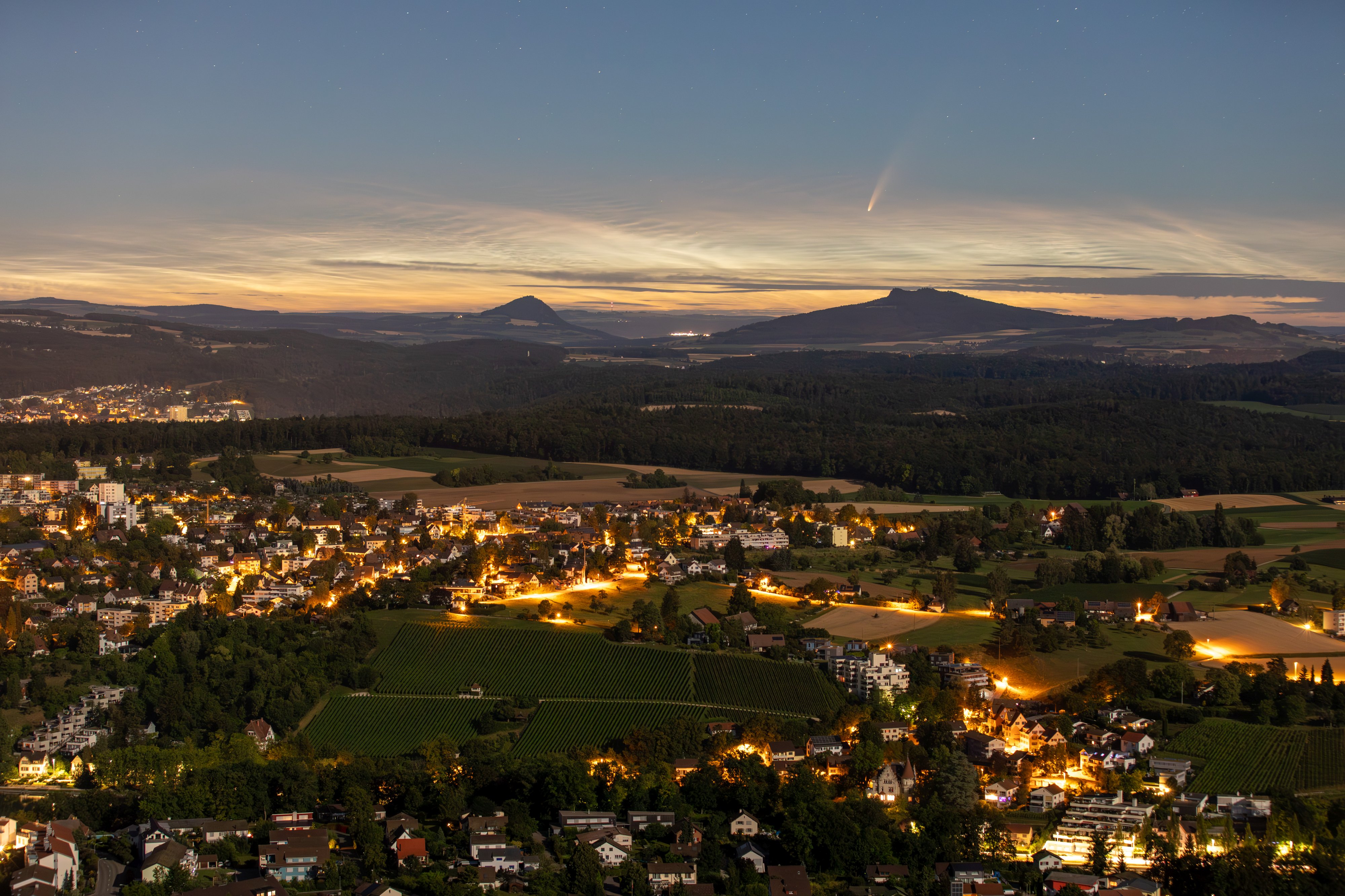 In der Nacht auf den 8. Juli 2020 hatte ich das Glück, den Kometen C/2020 F3 Neowise von der Aussichtsplattform auf dem Cholfirst bei Flurlingen zu fotografieren. Gegen 3:30 Uhr morgens, kurz vor Sonnenaufgang, zeigte er sich eindrucksvoll über Schaffhausen und Buchthalen. Neowise war einer der hellsten Kometen der letzten Jahrzehnte und selbst mit bloßem Auge sichtbar. Da er sich in Sonnennähe befand, war er in dieser Phase nur in den frühen Morgenstunden kurz vor Sonnenaufgang zu sehen. Wenige Tage zuvor und danach konnte er hingegen auch in der Abenddämmerung nach Sonnenuntergang beobachtet werden.