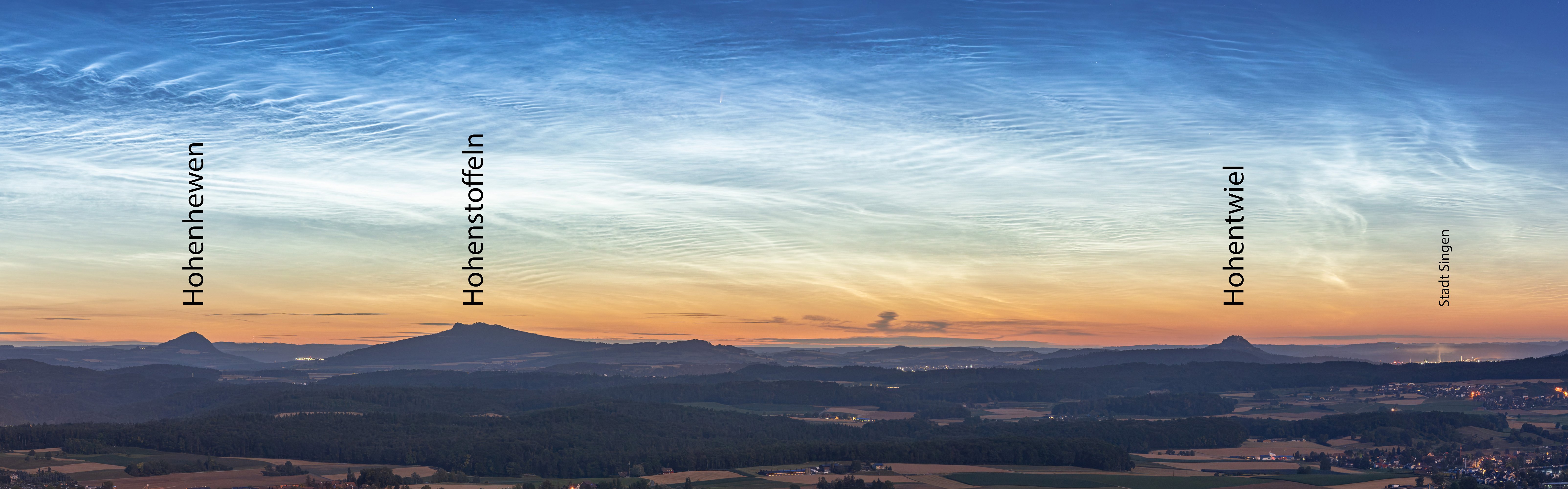 In meinem Panorama ist neben dem Kometen auch die markante Vulkanlandschaft des Hegau deutlich zu erkennen. Die Kegelberge dieser Region prägen den Horizont und verleihen der Szene eine besondere Tiefe. Besonders auffällig sind der Hohentwiel, der mächtige Vulkanberg mit seiner imposanten Festungsruine, sowie der Hohenhewen und der Hohenstoffeln, die beide mit ihren sanften, aber charakteristischen Formen hervorstechen. Der Hohenkrähen hingegen bleibt in dieser Ansicht verborgen, da er sich hinter dem Massiv des Hohentwiel verbirgt.