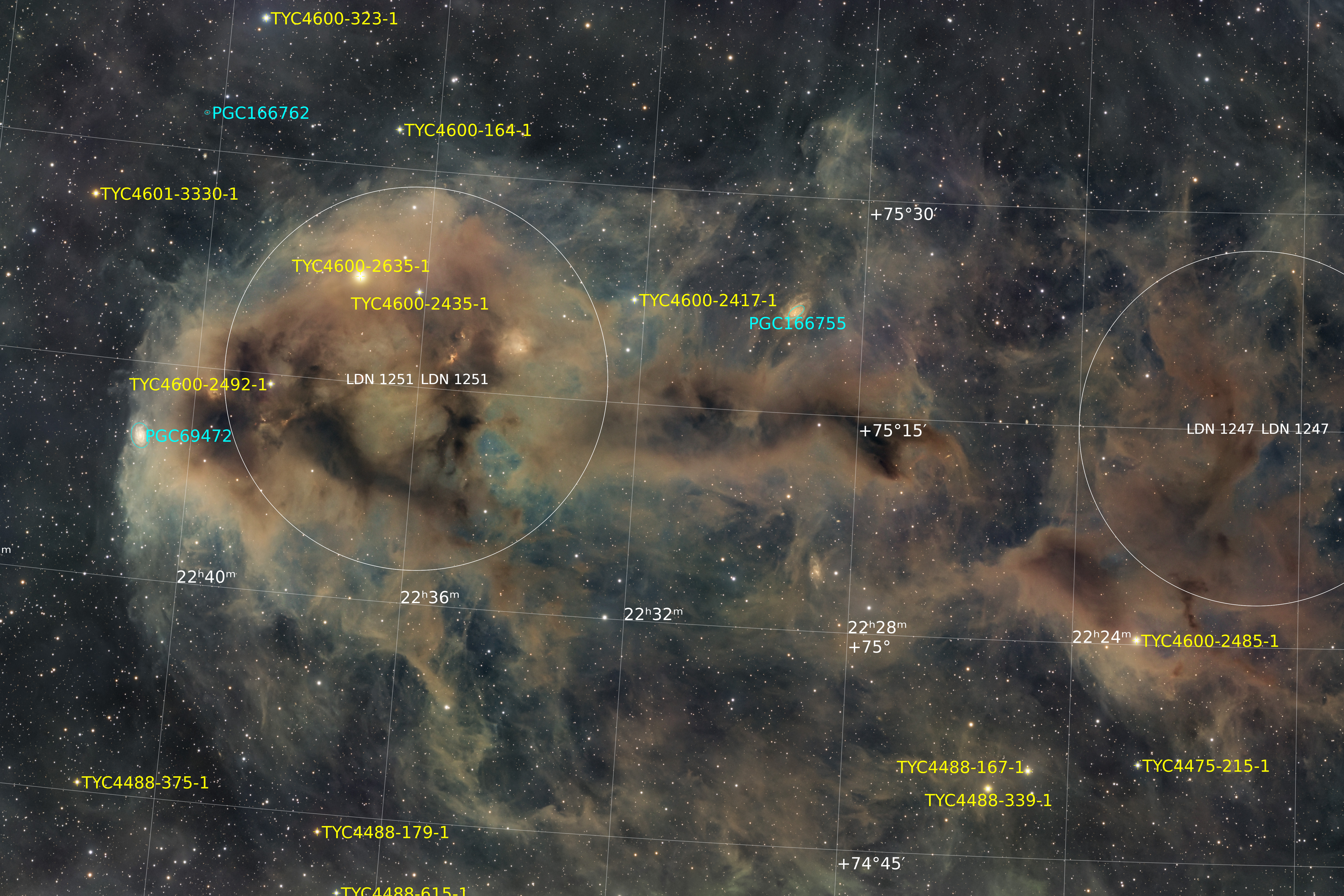 LDN 1251 ist eine ausgedehnte Dunkelwolke im Sternbild Cepheus, die in der Astrofotografie auch als „Verrotteter Fisch“ bezeichnet wird. Sie emittiert kein eigenes Licht, sondern wird allein durch das absorbierte und gestreute Licht der Hintergrundsterne sichtbar. Charakteristisch sind fein abgestufte Dichteunterschiede im Staub, die der Region eine ruhige, vielschichtige Struktur verleihen.