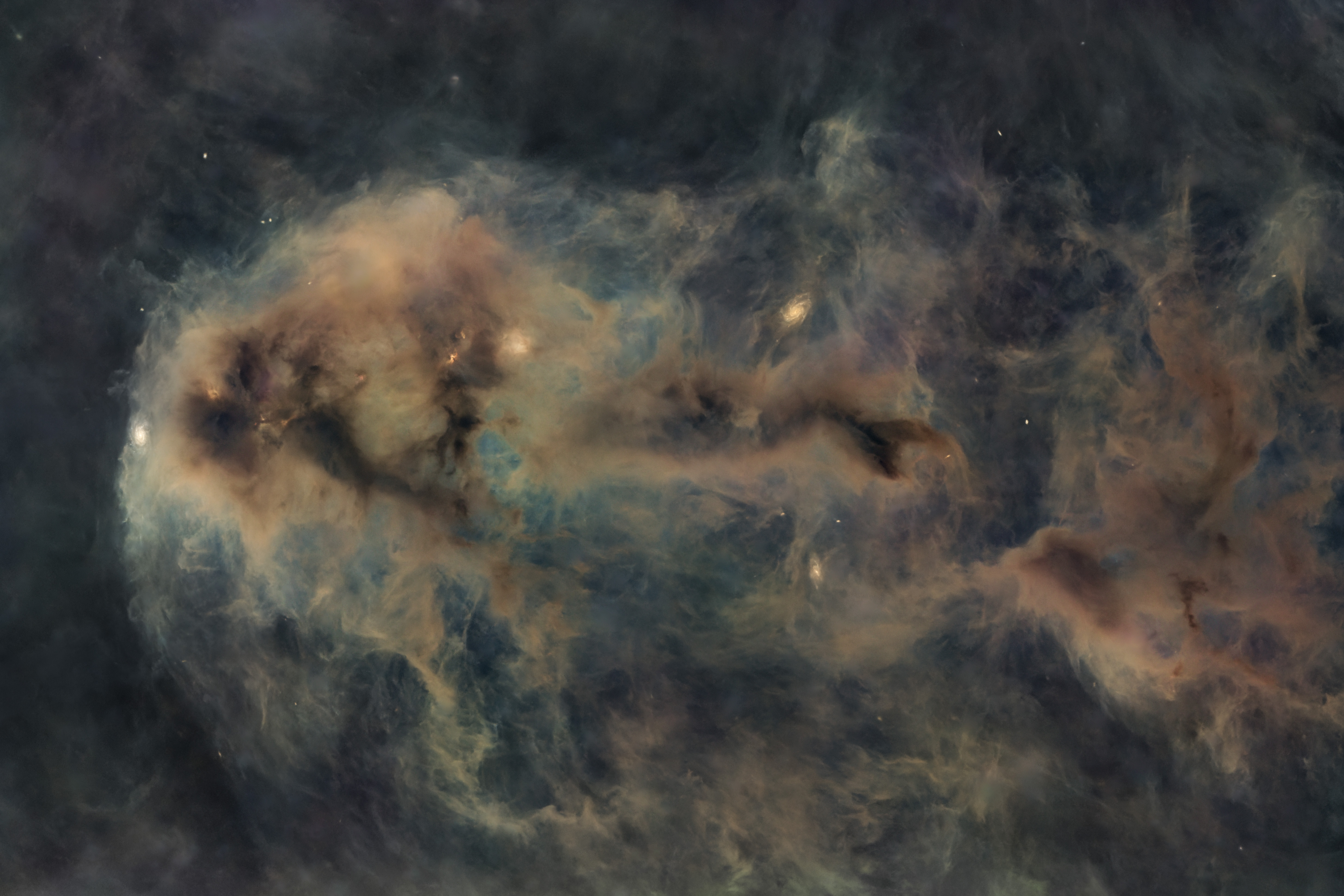 Die Aufnahme zeigt die Wolke nicht als isoliertes Objekt, sondern als zusammenhängende Struktur innerhalb der Milchstraße. Dichte, nahezu lichtundurchlässige Staubbänder gehen fließend in transparentere Regionen über. Feine Filamente, diffuse Übergänge und großskalige Strömungen prägen das Bild und geben einen Eindruck davon, wie komplex und dynamisch das interstellare Medium tatsächlich ist.