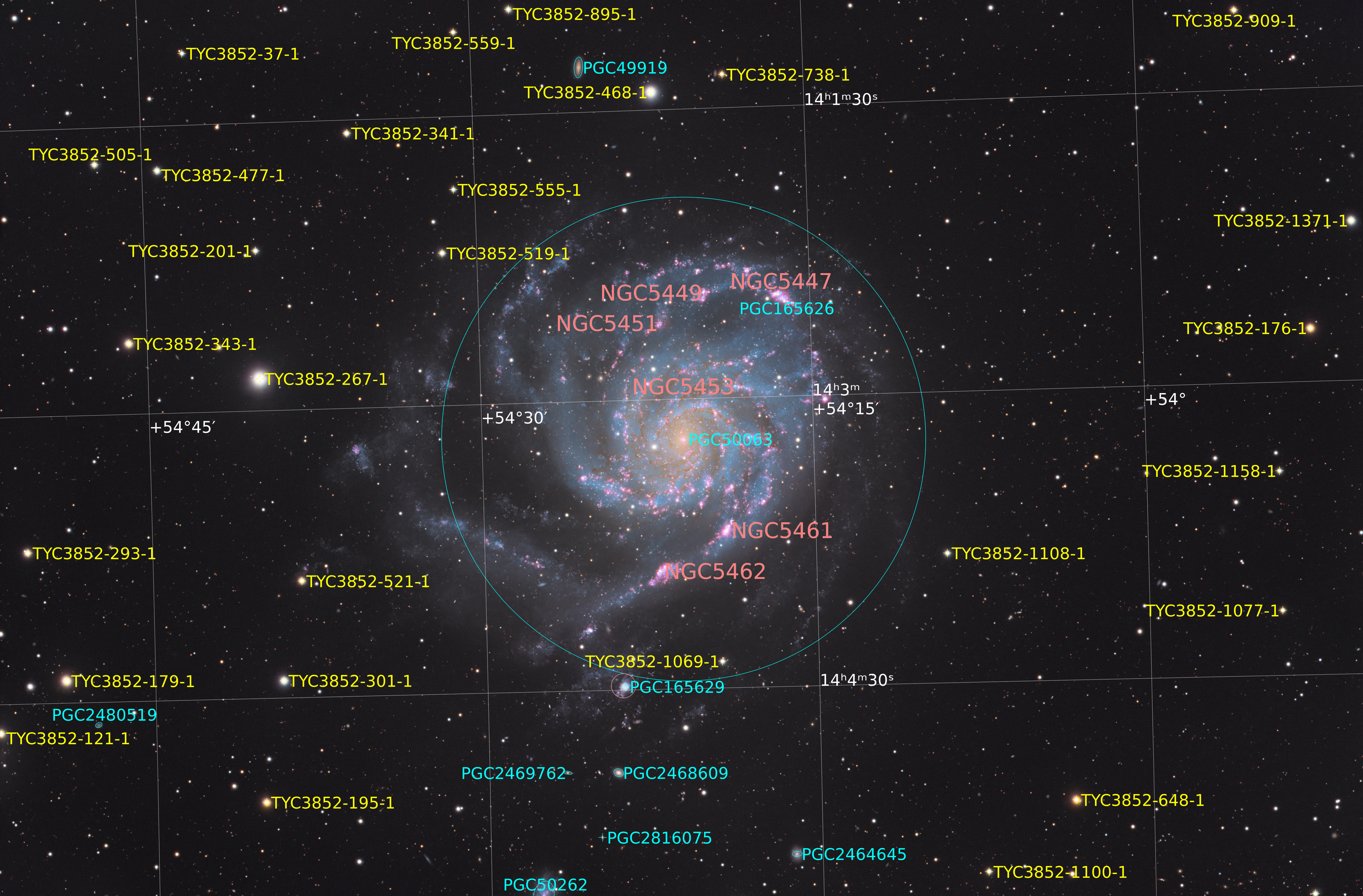 Messier 101, auch als Feuerradgalaxie oder Pinwheel Galaxy bekannt, ist eine der eindrucksvollsten Spiralgalaxien des nördlichen Himmels. Sie befindet sich im Sternbild Großer Bär und ist nahezu frontal zur Erde ausgerichtet. Mit einem scheinbaren Durchmesser von etwa 28 Bogenminuten erscheint sie größer als der Vollmond, besitzt jedoch eine vergleichsweise geringe Flächenhelligkeit. Ihre Entfernung beträgt rund 21 Millionen Lichtjahre, wodurch ihr Licht die Galaxie zu einer Zeit verlassen hat, als die menschliche Zivilisation noch in ihren Anfängen stand.