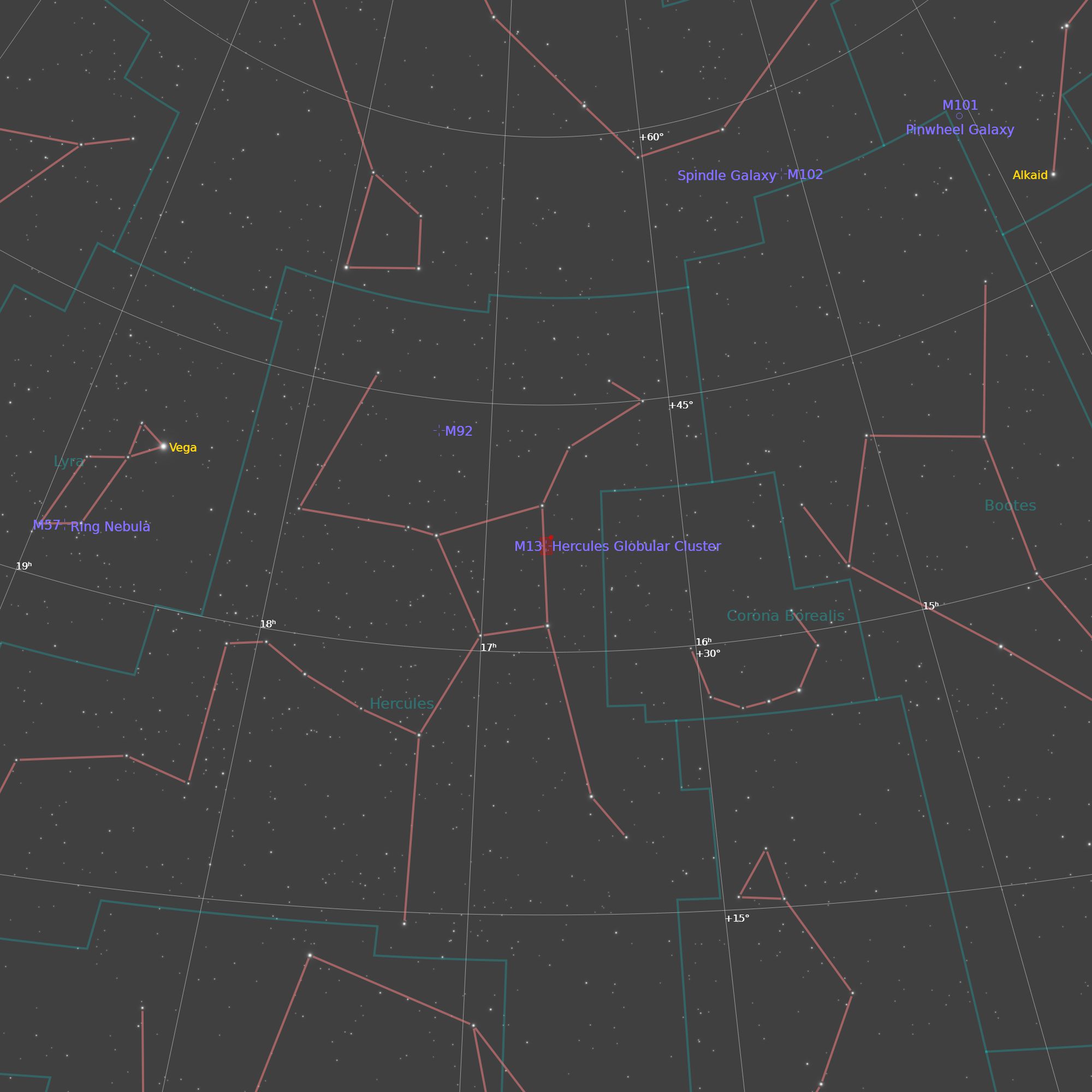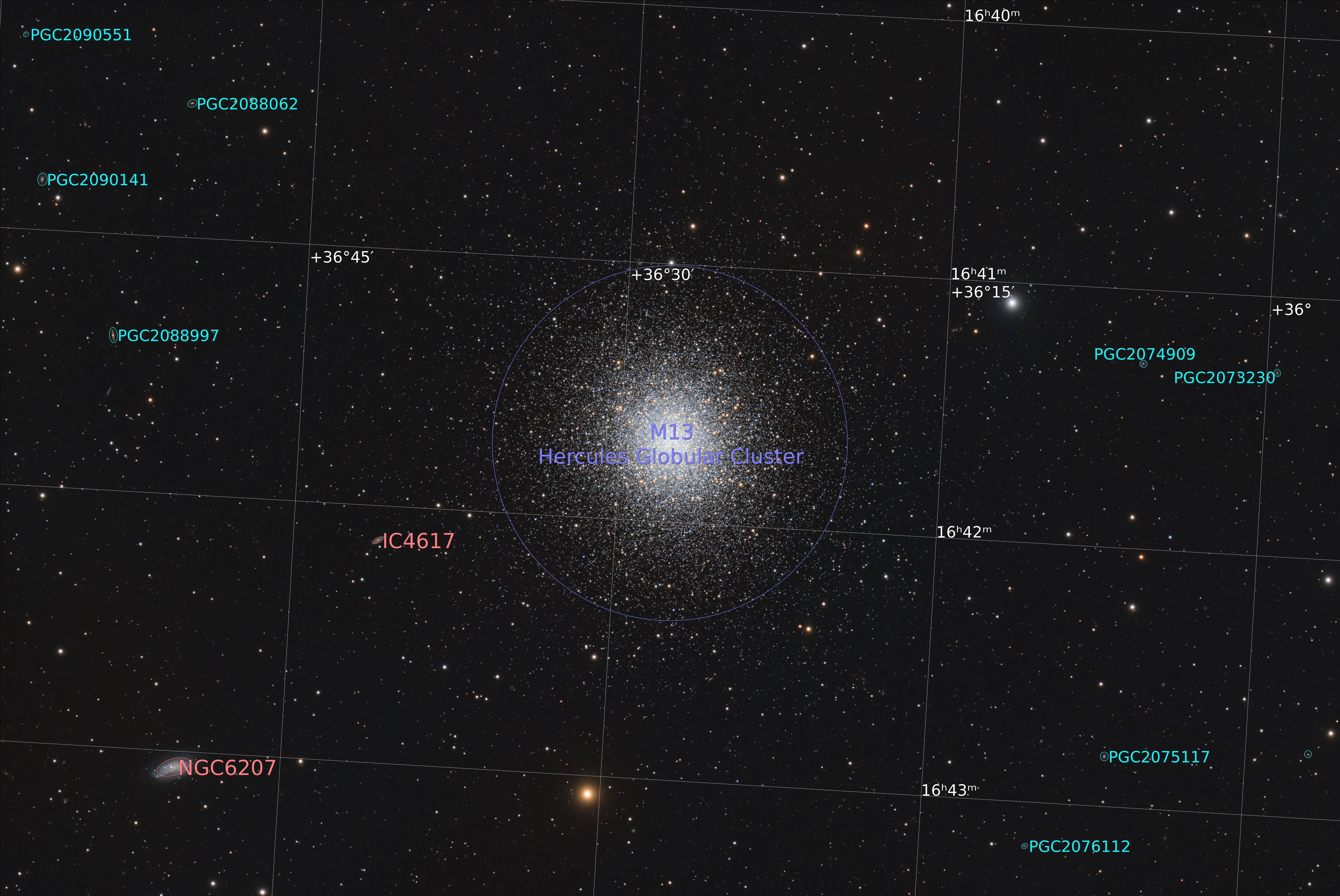 Der Herkuleshaufen Messier M13 ist ein kugelförmiger Sternhaufen im Sternbild Herkules, etwa 22.000 Lichtjahre von der Erde entfernt. Er enthält ungefähr 300.000 Sterne, die sehr alt sind, schätzungsweise 11 bis 12 Milliarden Jahre. M13 ist einer der hellsten und bekanntesten Kugelsternhaufen am nördlichen Himmel und kann bei guten Bedingungen sogar mit bloßem Auge gesehen werden. Der Haufen hat einen Durchmesser von etwa 145 Lichtjahren und eine dichte, leuchtende Kernregion. Er wurde 1714 vom Astronomen Edmond Halley entdeckt und später von Charles Messier in seinen berühmten Katalog aufgenommen. Aufgrund seiner beeindruckenden Größe und Helligkeit ist M13 ein beliebtes Ziel für Amateurastronomen und wird oft für astrophotografische Aufnahmen verwendet. M13 bietet einen faszinierenden Einblick in die frühe Geschichte unserer Galaxie und die Entwicklung von Sternen.