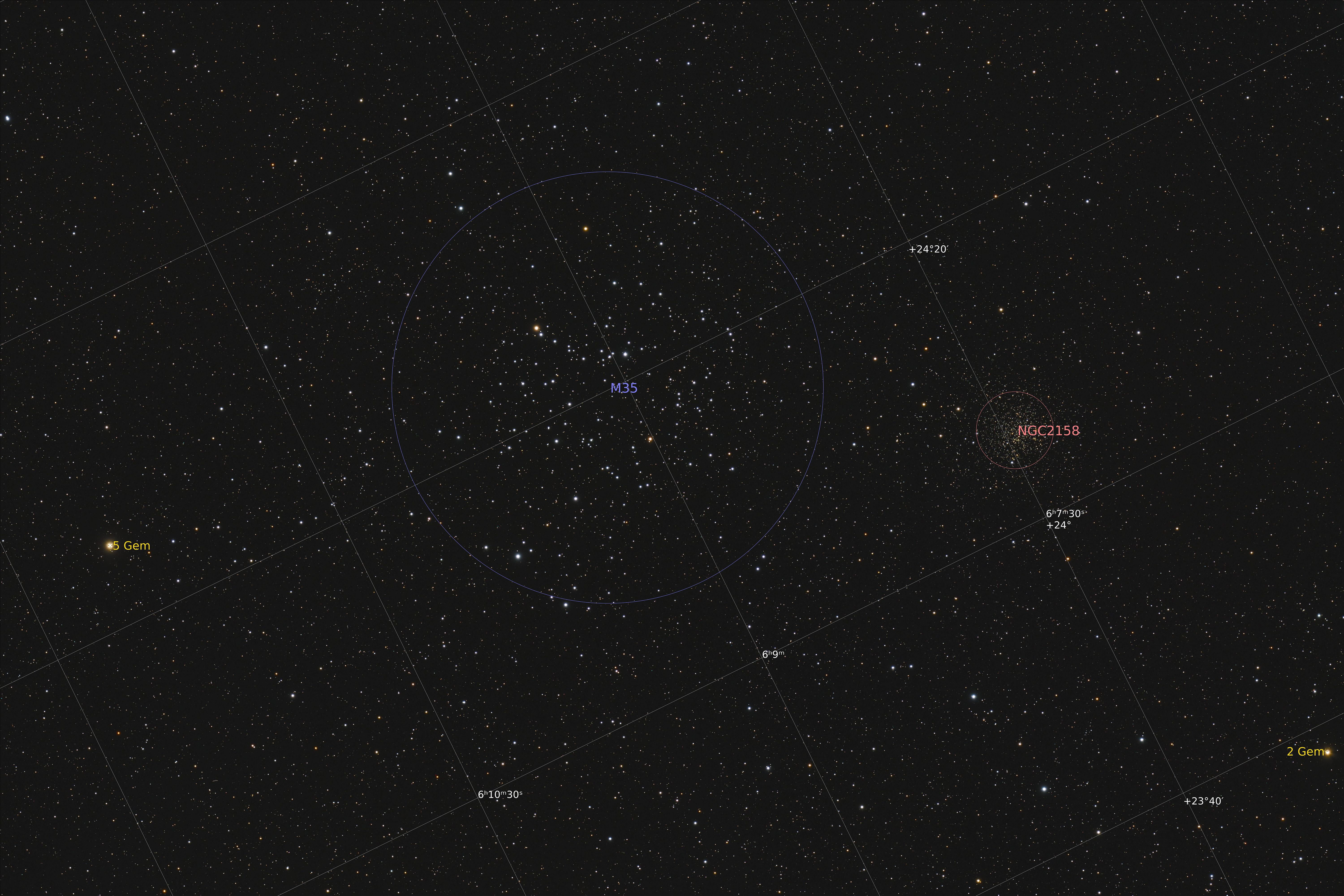 Messier 35 (M35) ist ein offener Sternhaufen im Sternbild Zwillinge (Gemini). Er wurde 1745 von dem Astronomen Jean-Philippe de Cheseaux entdeckt und später von Charles Messier in seinen Katalog aufgenommen. M35 befindet sich etwa 2.800 Lichtjahre von der Erde entfernt und hat einen Durchmesser von rund 20 Lichtjahren. Der Haufen enthält mehr als 500 Sterne, die überwiegend junge, heiße Sterne sind. Der Cluster ist schätzungsweise 100 Millionen Jahre alt und gehört somit zu den jüngeren Sternhaufen. In seiner Nähe befindet sich der etwas weniger auffällige, aber ähnliche Sternhaufen NGC 2158, der älter und dichter ist. M35 ist mit einem Teleskop gut sichtbar und bietet Astronomen faszinierende Einblicke in die Sternentstehung. Die Sterne des Haufens sind relativ nahe beieinander, was zu einer hohen Dichte im Vergleich zu anderen offenen Haufen führt. Der Cluster ist in vielen verschiedenen Wellenlängenbereichen, wie im Infrarot, gut zu beobachten. M35 ist ein beliebtes Ziel für Amateurastronomen, die den Haufen in klaren Nächten leicht finden können. In der nördlichen Hemisphäre ist M35 vor allem im Winter und Frühling gut sichtbar, wobei die beste Zeit zur Beobachtung zwischen Dezember und April liegt.