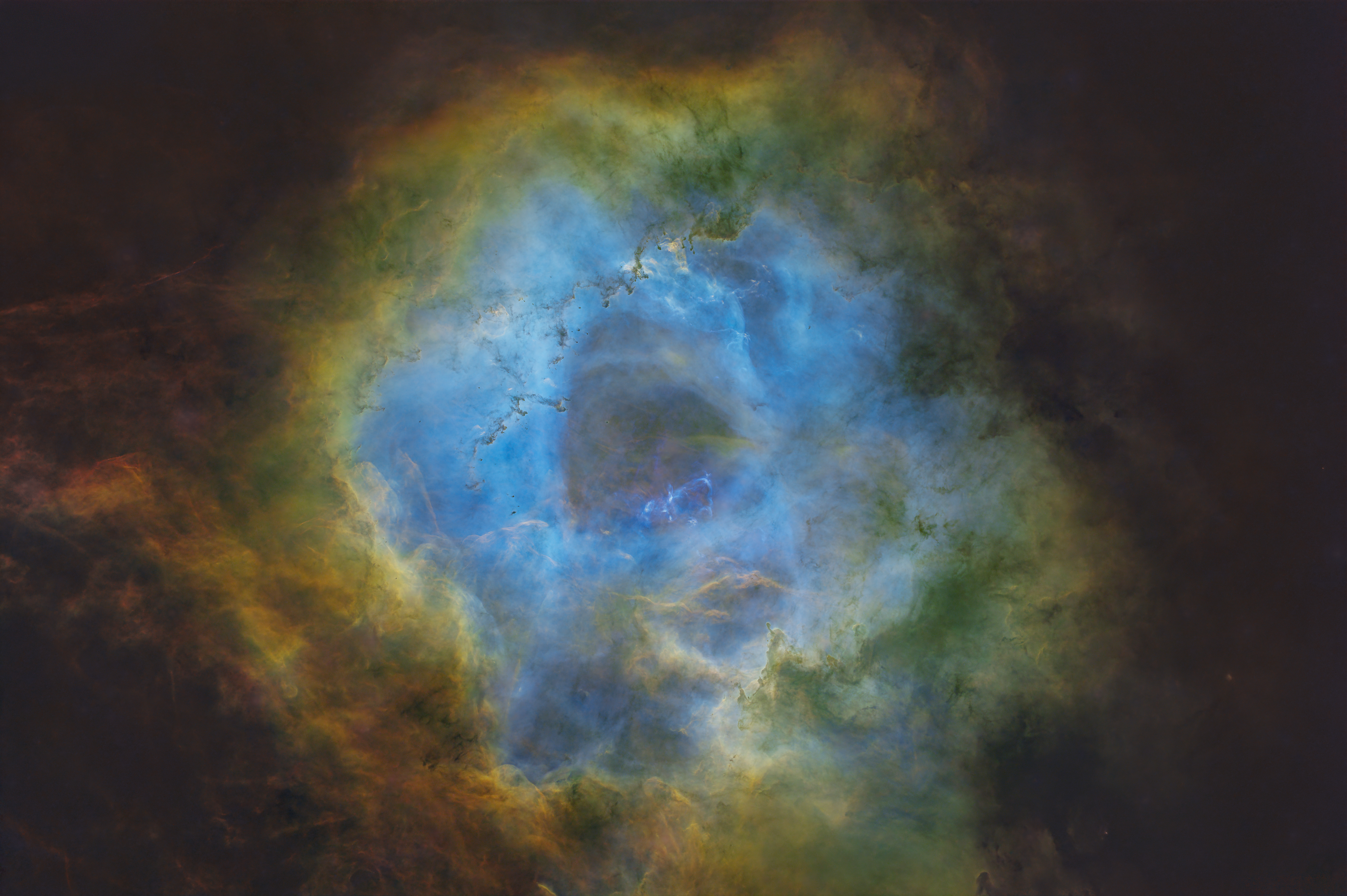 Der Rosettennebel im Sternbild Einhorn ist eine ausgedehnte H-II-Region, deren Erscheinungsbild maßgeblich durch den offenen Sternhaufen NGC 2244 geprägt wird. Die jungen, massereichen Sterne im Zentrum emittieren intensive ultraviolette Strahlung und treiben starke Sternwinde an. Beides zusammen ionisiert das umgebende Gas und formt über lange Zeiträume die großräumige Struktur des Nebels.