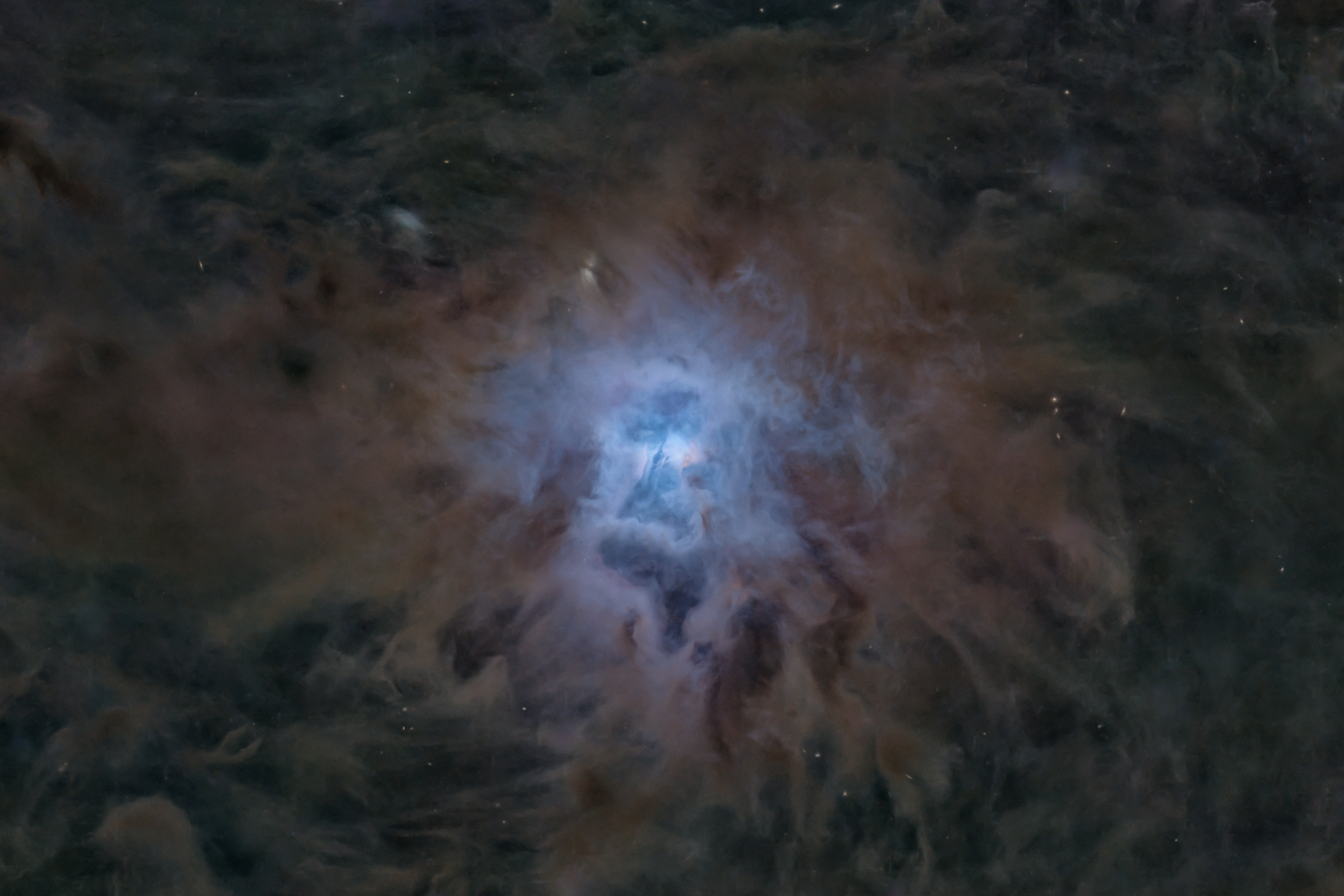 Im Zentrum der Aufnahme fällt ein intensiv blau leuchtender Bereich ins Auge. Dieses Licht stammt nicht aus ionisiertem Gas, sondern ist reflektiertes Sternlicht. Feine Staubpartikel streuen bevorzugt kurzwellige Anteile des Lichts, weshalb der Nebel seine charakteristische blaue Farbe zeigt.
