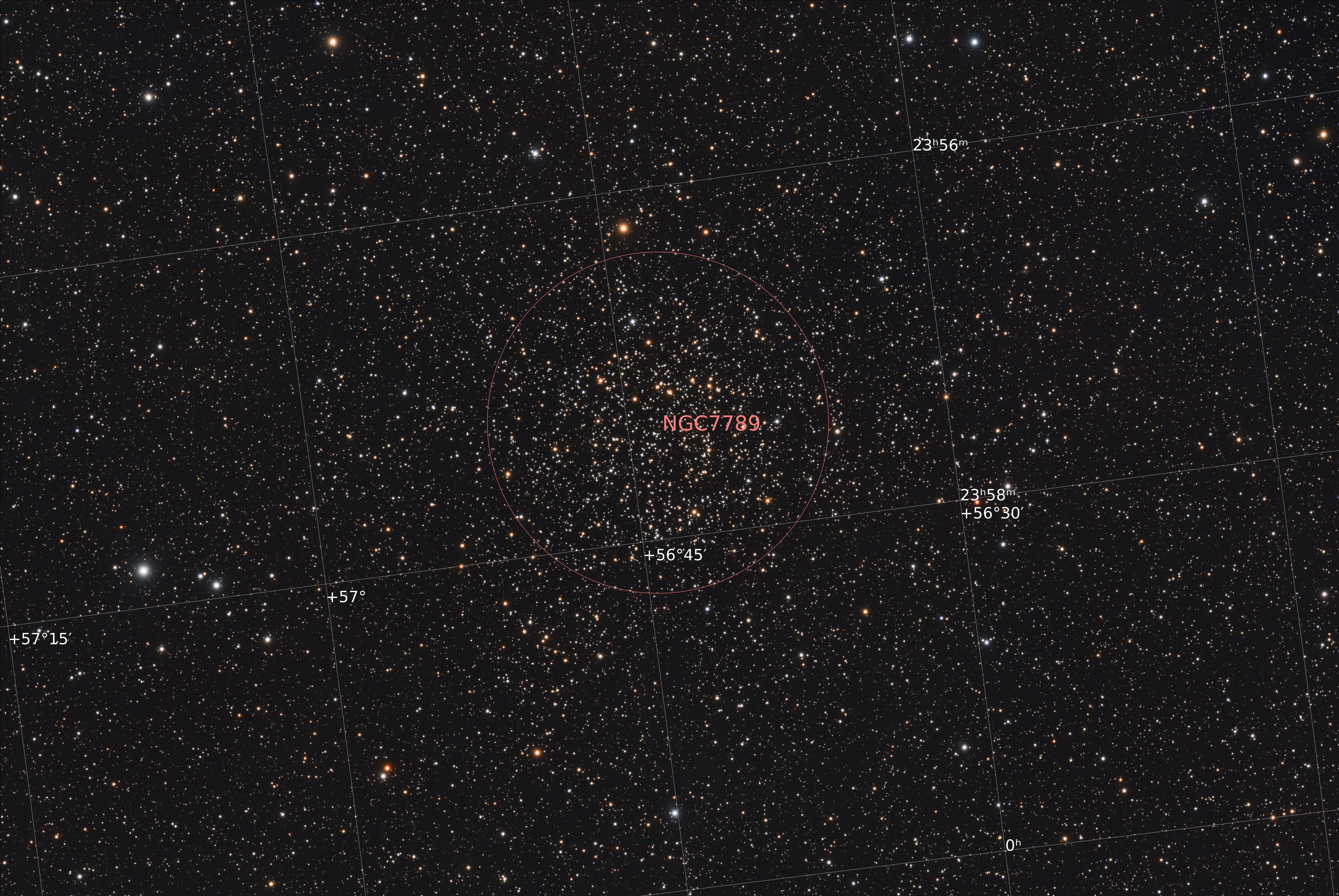 NGC 7789, auch als Herschels Spiralhaufen oder Caroline’s Rose bekannt, ist ein offener Sternhaufen im Sternbild Kassiopeia. Er wurde 1783 von der britischen Astronomin Caroline Herschel entdeckt und später von ihrem berühmteren Bruder William katalogisiert. Der Haufen liegt etwa 7.500 Lichtjahre von der Erde entfernt und hat ein geschätztes Alter von 1,6 Milliarden Jahren. NGC 7789 ist reich an Sternen, die überwiegend zur Population II gehören, was bedeutet, dass sie einen höheren Anteil an schweren Elementen besitzen. Die dichte Ansammlung von Sternen ergibt ein Erscheinungsbild, das an eine Rosenblüte erinnert, wenn es durch ein Teleskop betrachtet wird.
